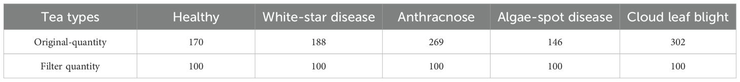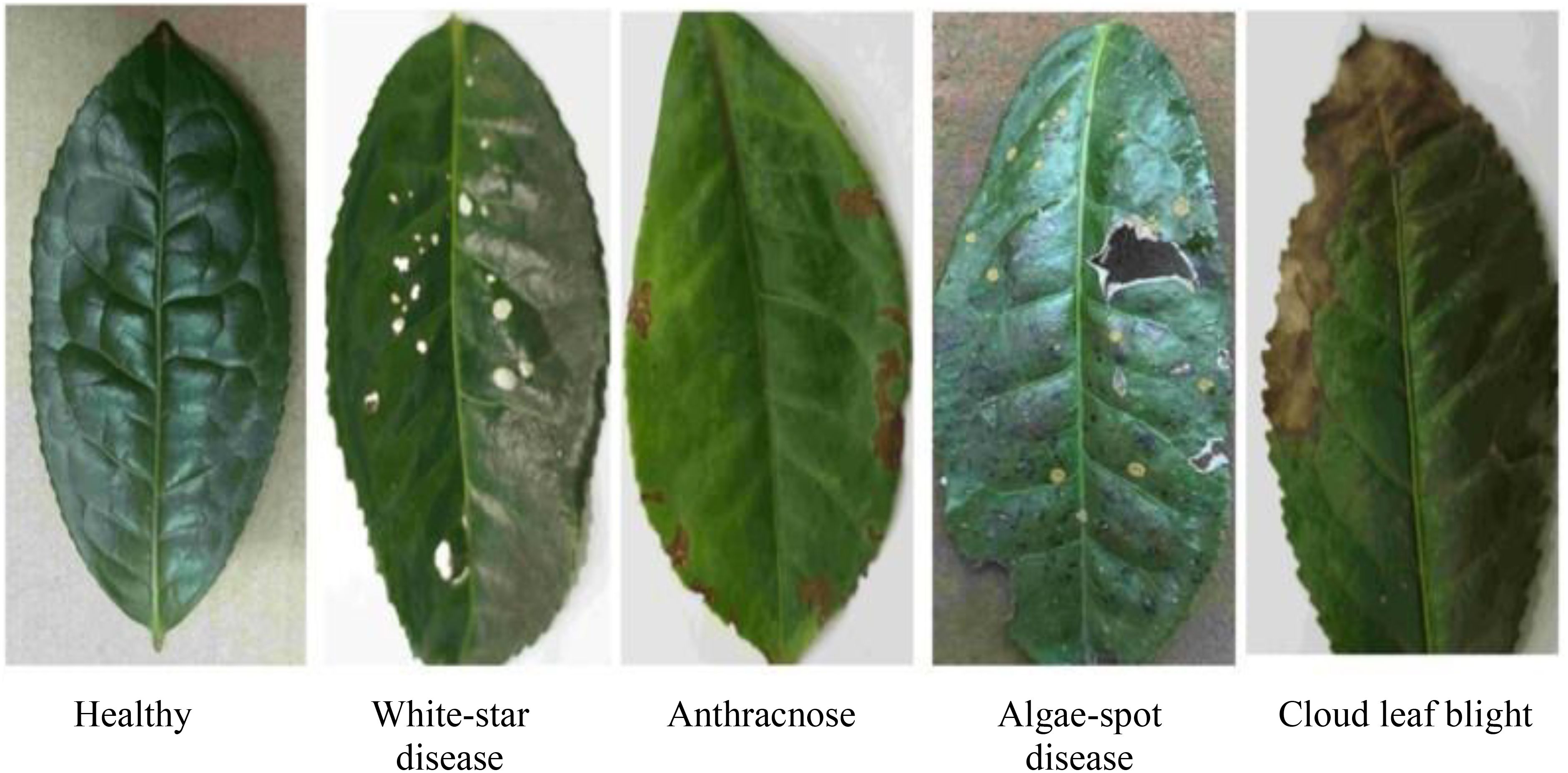 Tea leaf images were collected from the tea plantation located at the back hill of Yunnan Agricultural University in Panlong District, Kunming City, Yunnan Province. Four common diseases that significantly impact tea production were selected as the subjects of this study: White-star disease, Anthracnose, Algae-spot disease, and Cloud leaf blight. Disease images are shown in Figure 1. All leaf samples were photographed in the field against a uniform white background using a digital SLR camera, with an image resolution of 5472 × 3648 pixels, ensuring even lighting and no shadow interference. A total of 1075 valid images were collected, categorized to form the tea disease dataset (see Table 1).