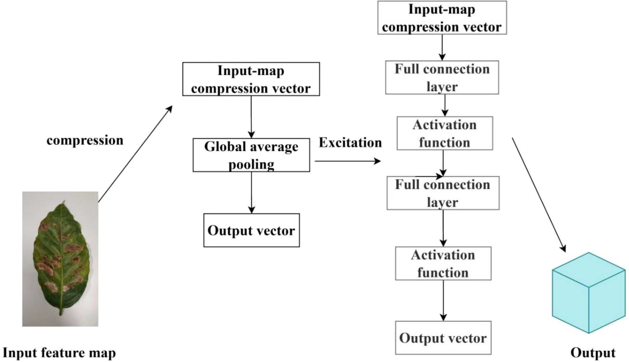 The SE block “squeezes” spatial information through a global average pooling operation to generate channel-wise descriptors, then learns inter-channel dependencies via fully connected layers, and finally outputs a set of weighting coefficients to “re-calibrate” the feature maps across channels. This mechanism enables the model to dynamically enhance responses from channels that are important for disease texture representation, while suppressing interference from background or irrelevant textures, thereby improving the discriminative power of feature representation under few-shot conditions. The architecture of the SELayer is shown in Figure 5, and the overall structure of the proposed SinGAN-SE model is illustrated in Figure 6.