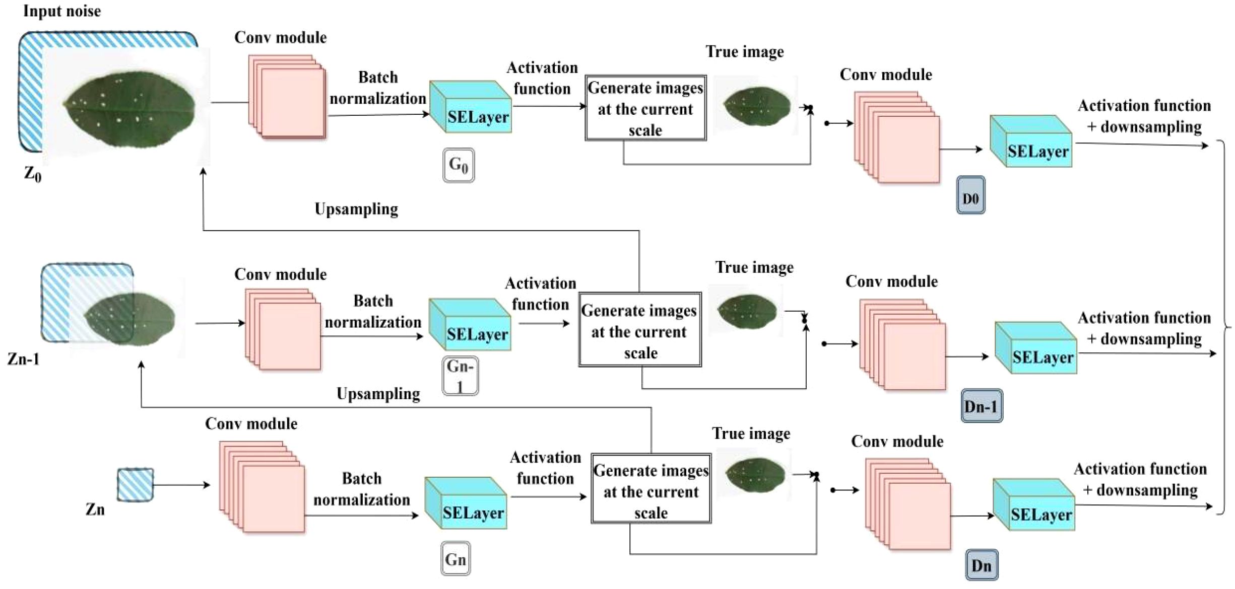 SinGAN represents an even more extreme few-shot generation paradigm—requiring only a single training image to construct a multi-scale generative network (Shaham et al., 2019). The model builds a pyramid structure, training independent generator-discriminator pairs at multiple resolution levels to achieve coarse-to-fine image synthesis. Each level learns the local texture and structural statistical characteristics of the input image and generates visually diverse new samples by incorporating noise inputs. Due to its independence from class labels or large datasets, and its ability to effectively preserve the semantic structure of the original image, SinGAN demonstrates unique advantages in tasks involving scarce and structurally complex samples, such as agricultural disease images.