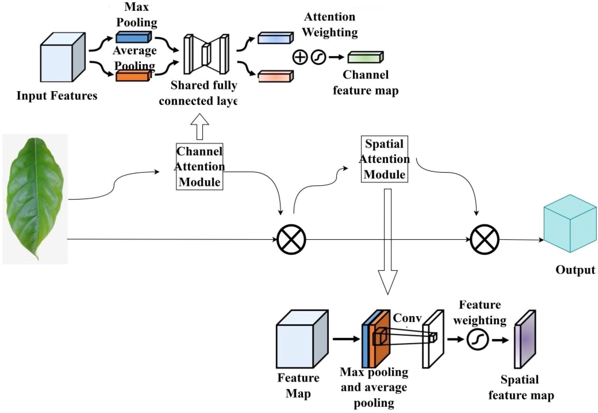 CBAM first computes the importance weights of each feature channel through the channel attention sub-module. This mechanism is similar to SE, but employs dual pathways of max pooling and average pooling to enhance feature representation. Subsequently, the spatial attention sub-module calculates spatial position weights based on the channel-aggregated feature map, amplifying the response strength of key regions, thereby more precisely capturing the spatial distribution patterns of diseases. The architecture of CBAM is illustrated in Figure 7.