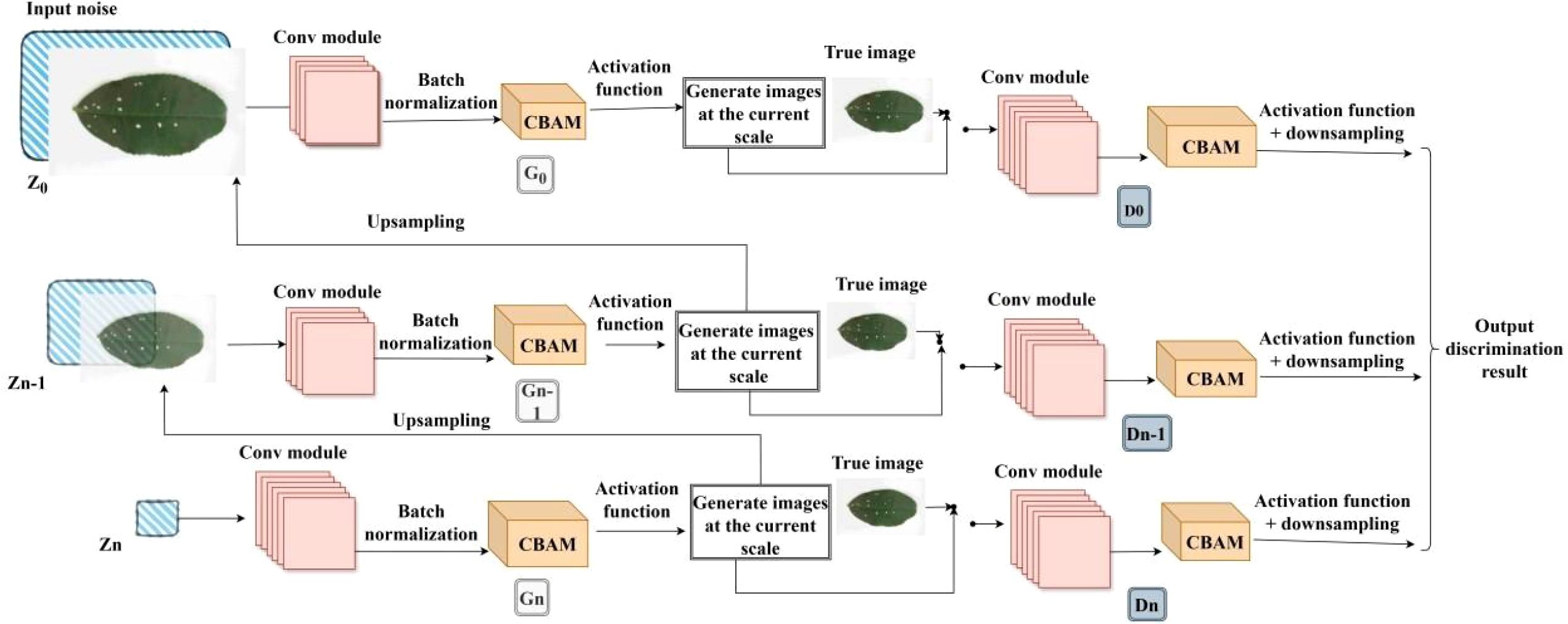 In SinGAN-CBAM, the CBAM module is embedded after each convolutional block in both the generator and discriminator, participating in the entire generation process from low to high resolution. This design helps mitigate the loss of fine-grained textures in multi-scale generation, particularly enhancing the modeling capability of local details such as lesion edges and color transitions at high-resolution stages. The training strategy remains consistent with that of SinGAN-SE, employing a layer-by-layer training and alternating optimization approach to ensure training stability even after the integration of attention mechanisms. The architecture of the improved model is illustrated in Figure 8.