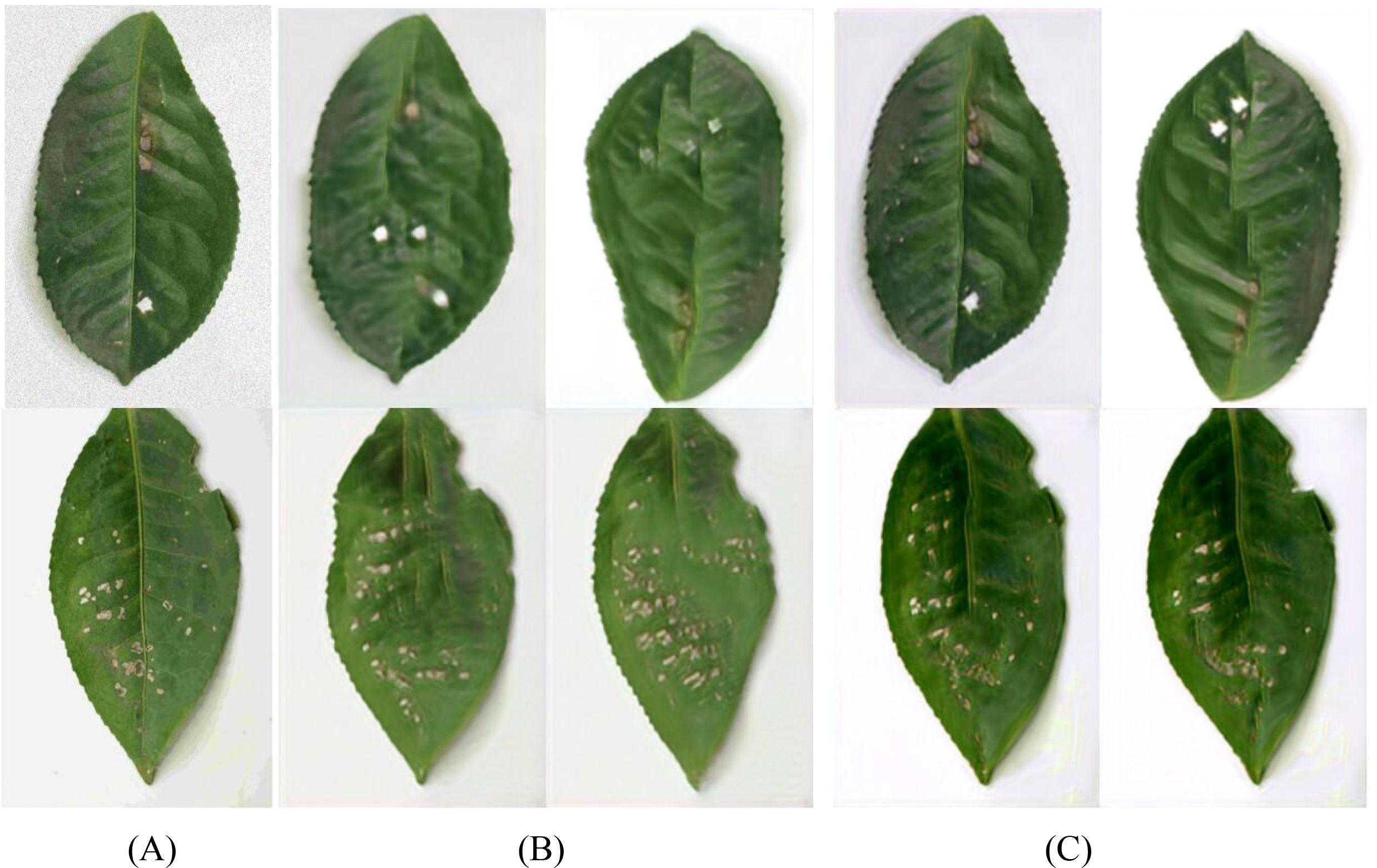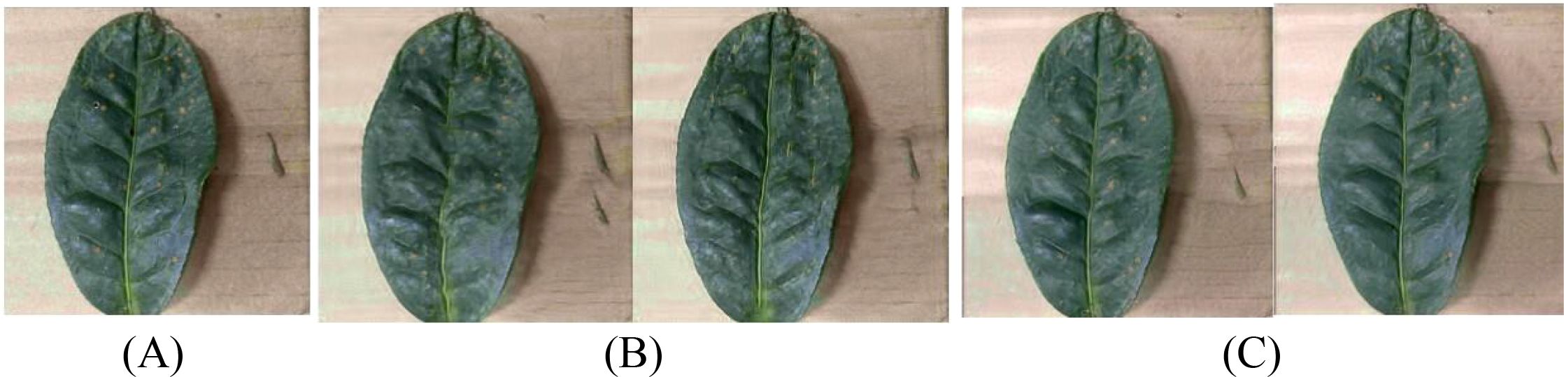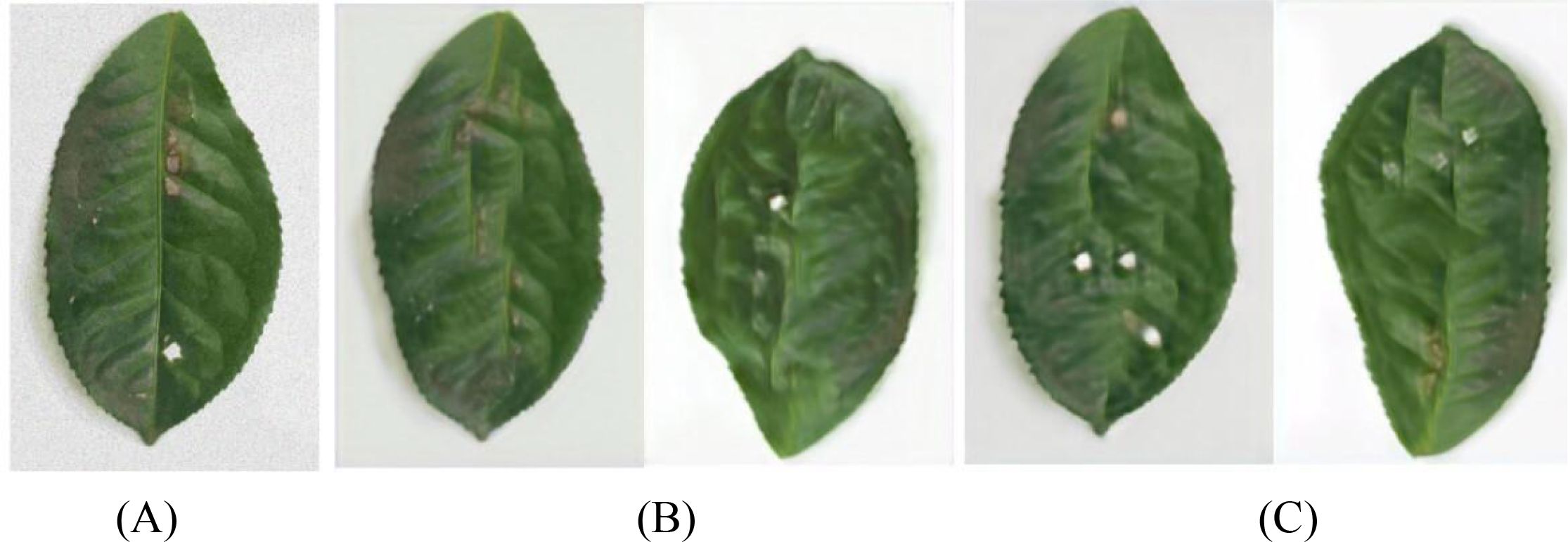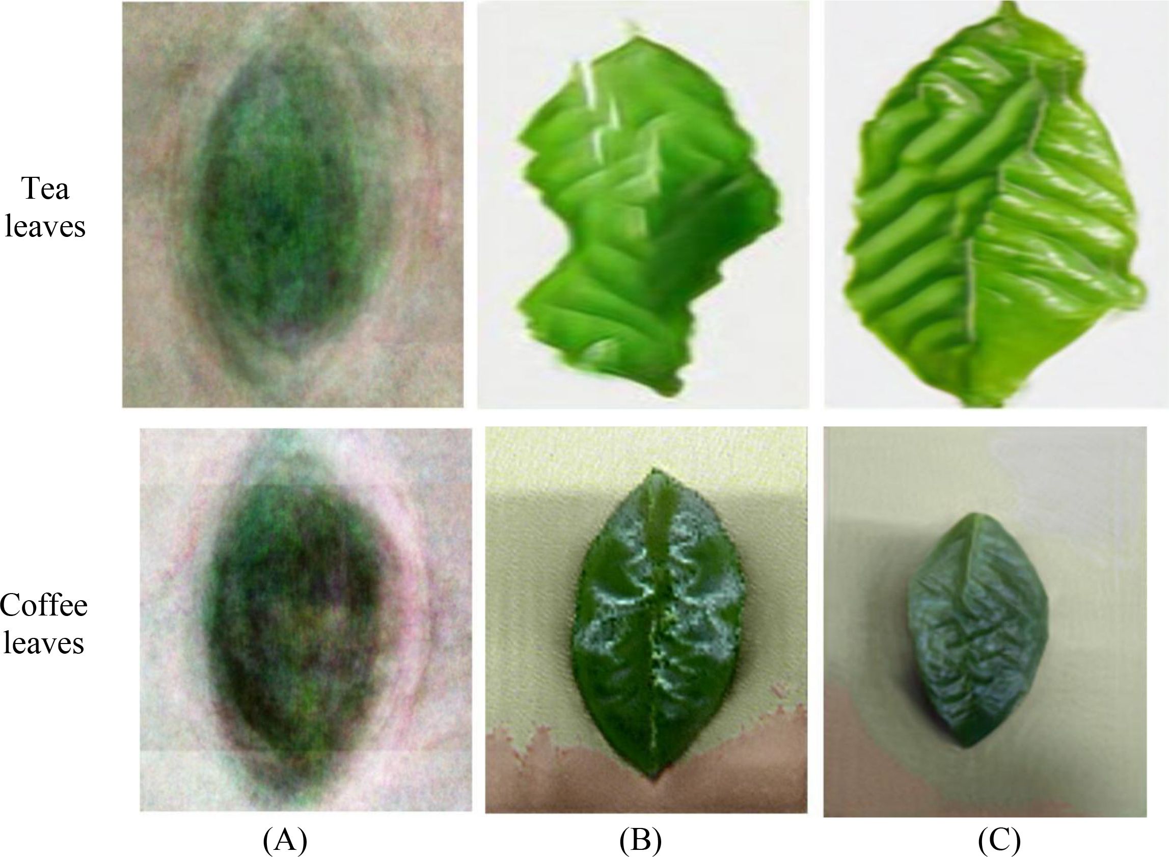 Figure 9. Example of the generated image of healthy tea and coffee leaves. (A) GAN-generated images; (B) Fast-GAN-generated images; (C) SinGAN-generated images.