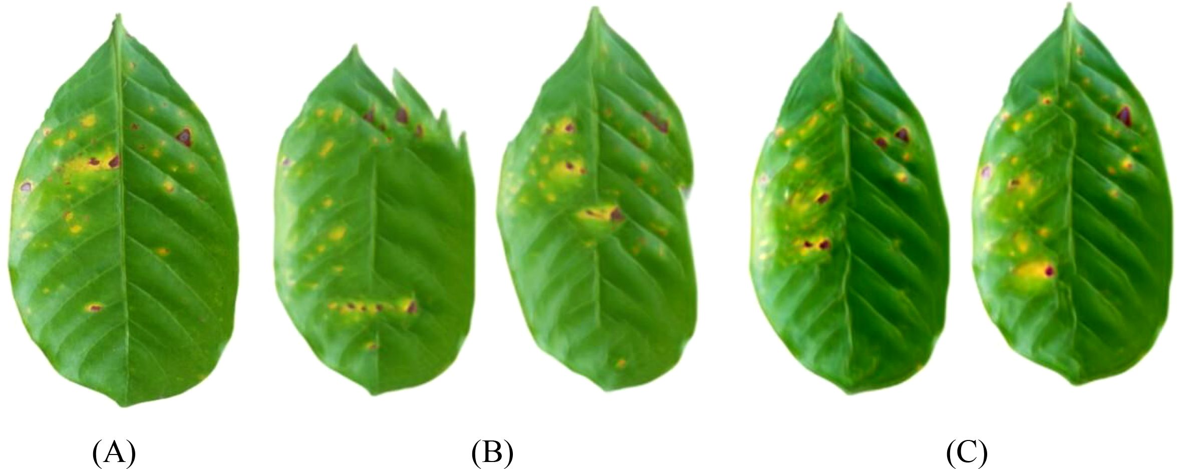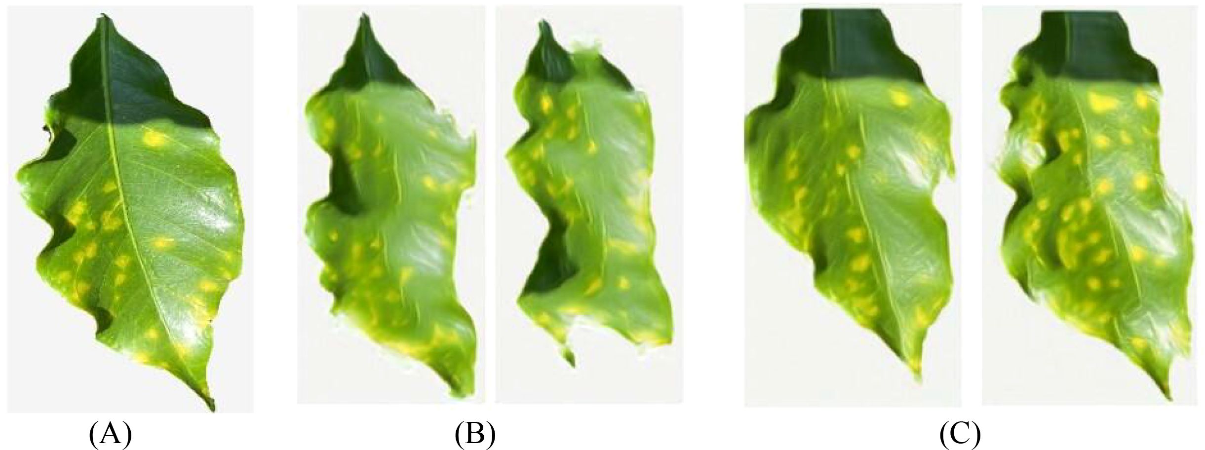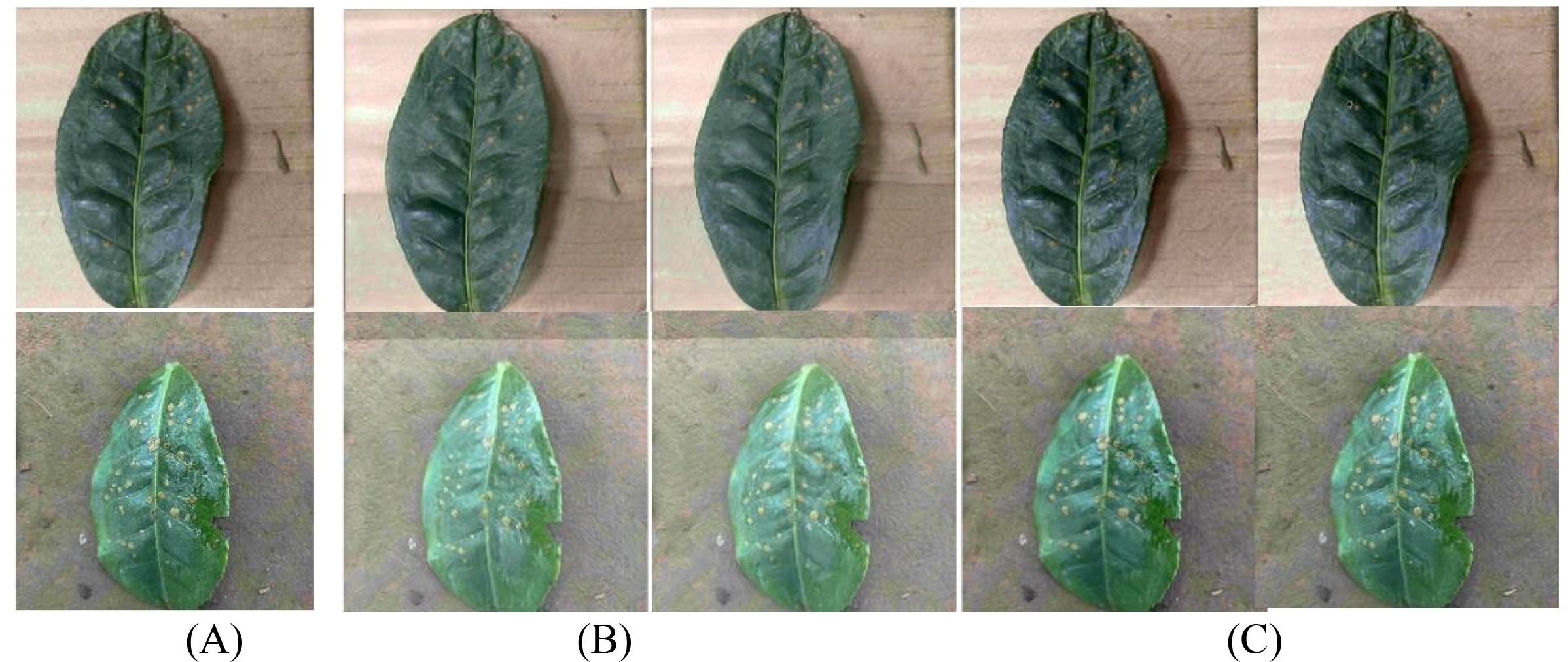 Figure 16. Generated images of coffee leaf rust disease. (A) Original image; (B) SinGAN generated images; (C) SinGAN-CBAM generated images.