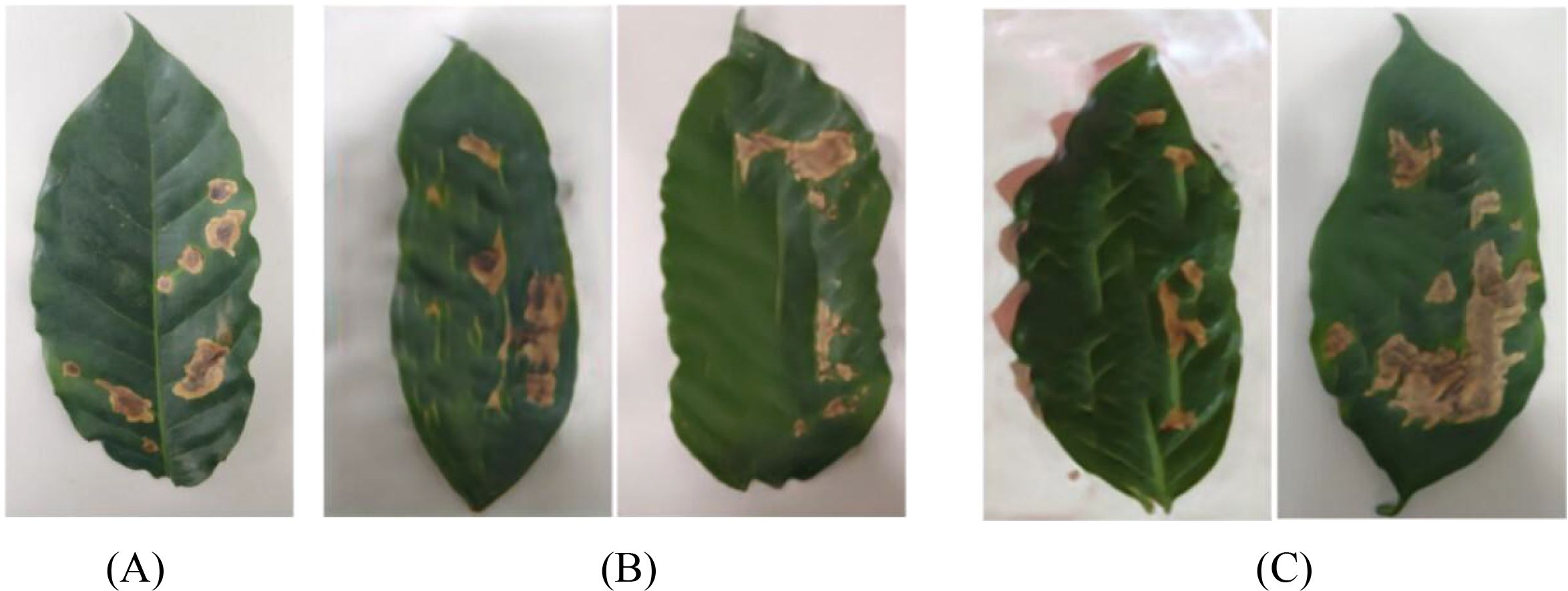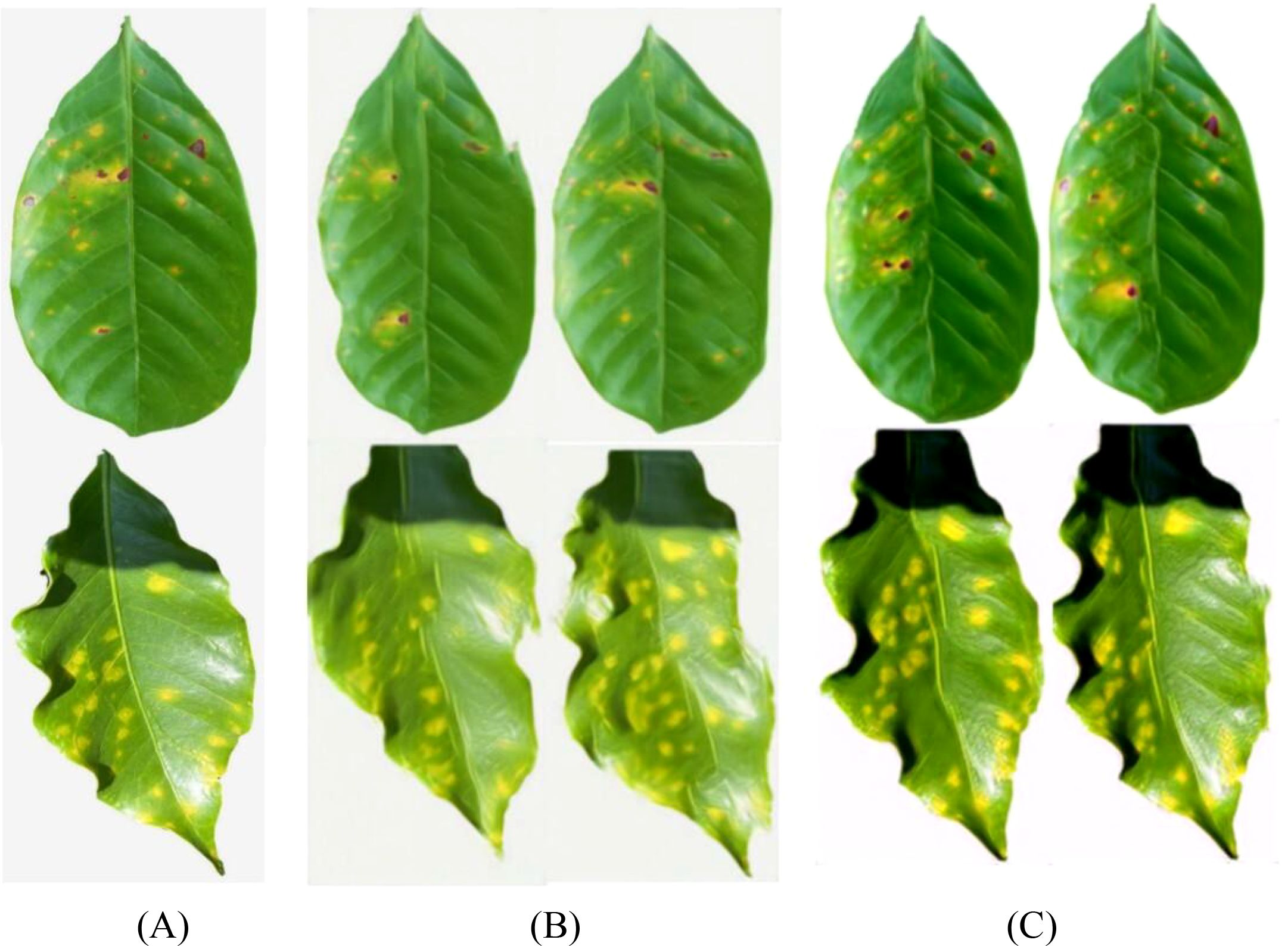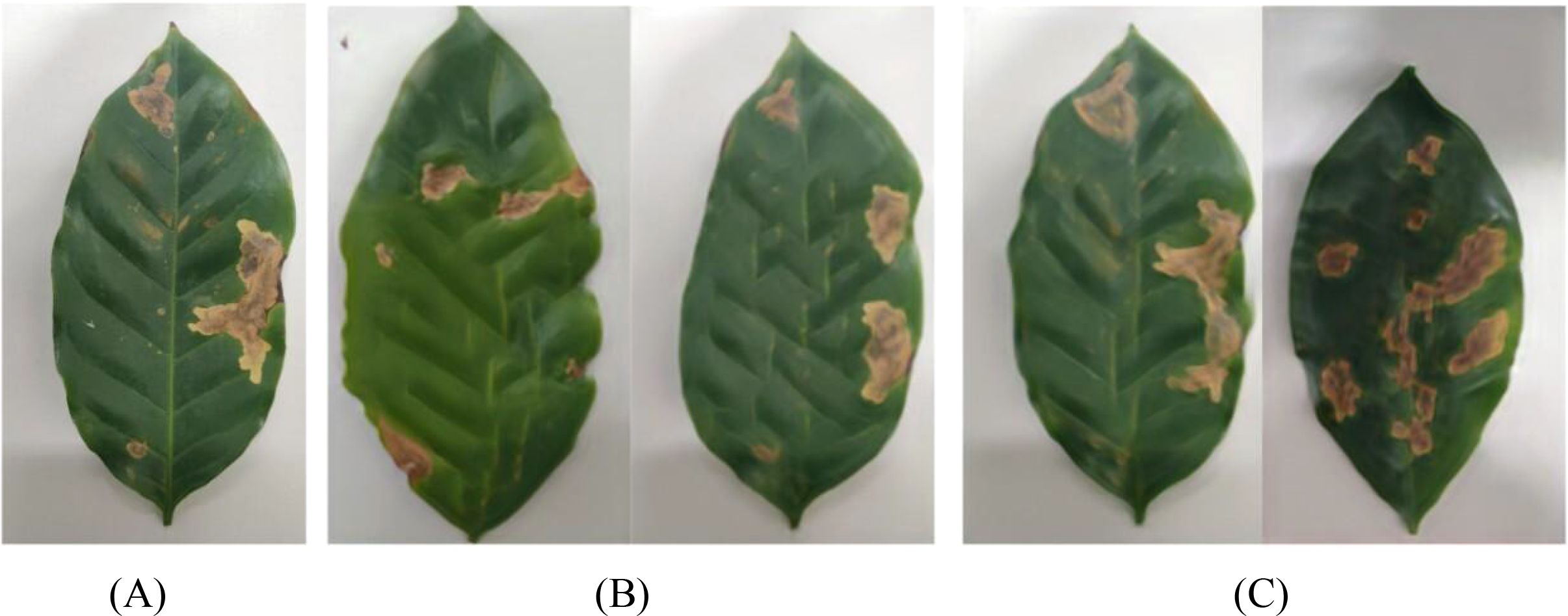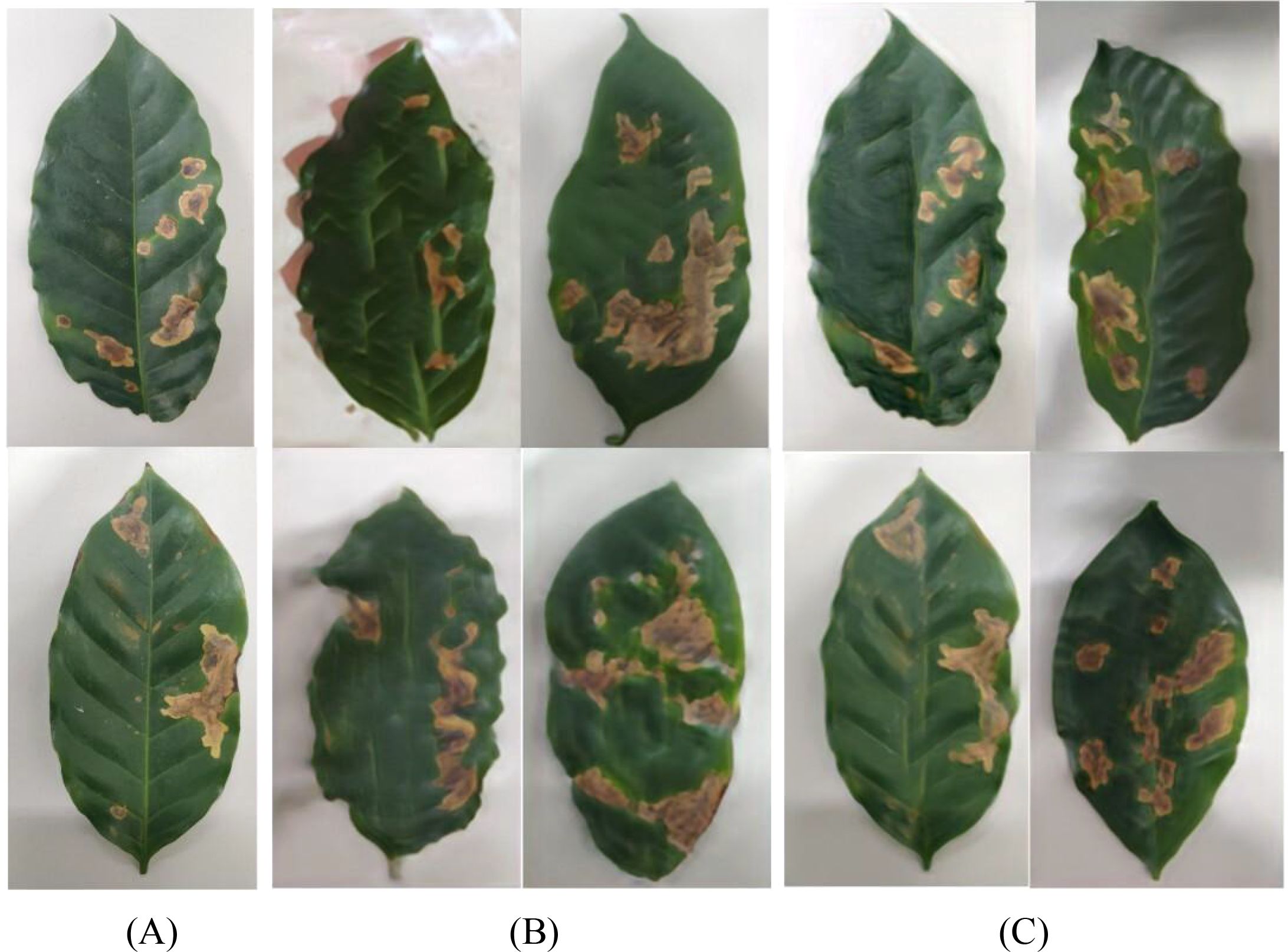 Figure 16. Generated images of coffee leaf rust disease. (A) Original image; (B) SinGAN generated images; (C) SinGAN-CBAM generated images.