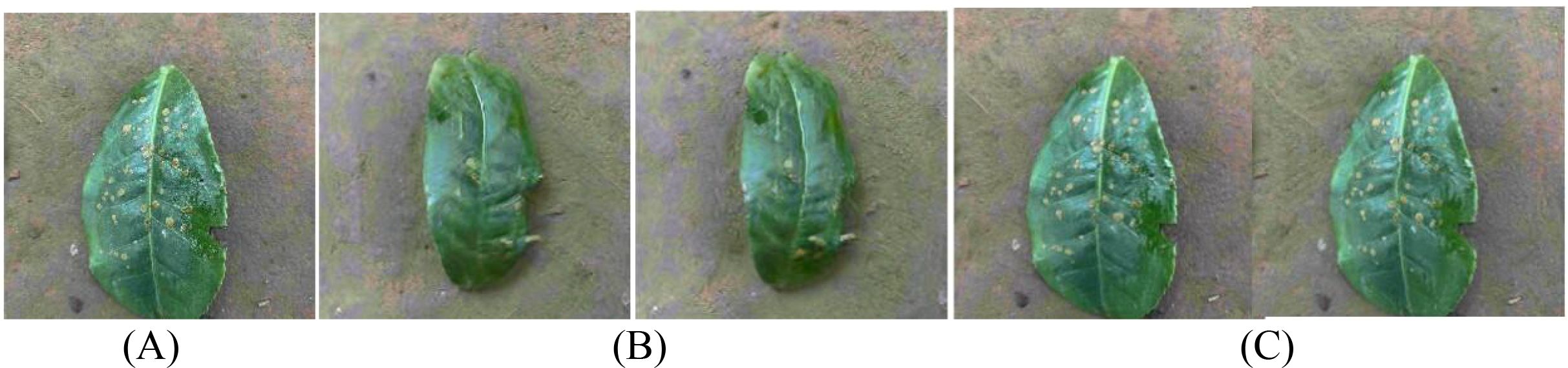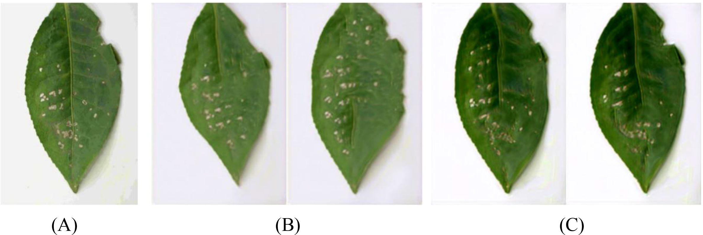 Figure 21. Coffee leaf miner moth generation image. (A) Original image; (B) SinGAN generated images; (C) SinGAN-CBAM generated images.