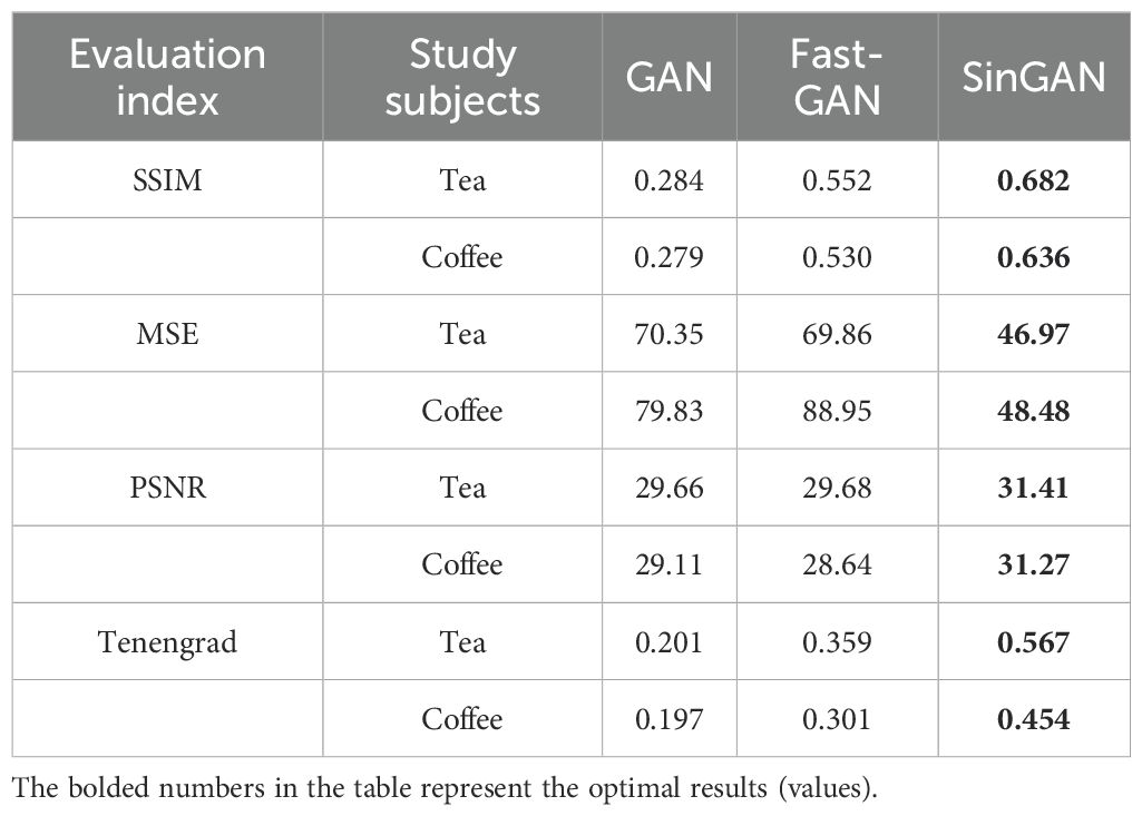 Comprehensive metric analysis shows that SinGAN outperforms GAN and Fast-GAN across all evaluation dimensions, demonstrating superior generation performance. In tea image generation, SinGAN achieves a 23.6% improvement in SSIM over Fast-GAN, a 32.8% reduction in MSE, and a PSNR of 31.28, representing a 5.9% increase; for coffee images, SSIM improves by 20.0%, MSE decreases by 45.5%, and PSNR increases by 7.4% to 30.70. Furthermore, SinGAN’s Tenengrad value is significantly higher than that of the other models, indicating sharper edges in the generated images. These results validate SinGAN’s superiority in few-shot agricultural image generation tasks and confirm its better suitability for the target crop data characteristics in this study.