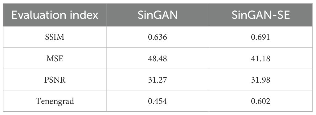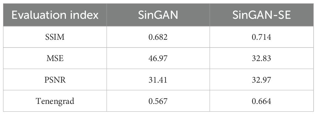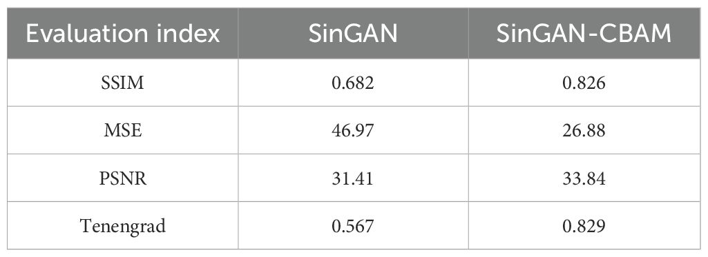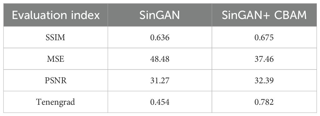 To verify the effectiveness of CBAM, this paper quantitatively evaluates SinGAN and SinGAN-CBAM using the same metrics, with the results shown in Tables 7 and 8.