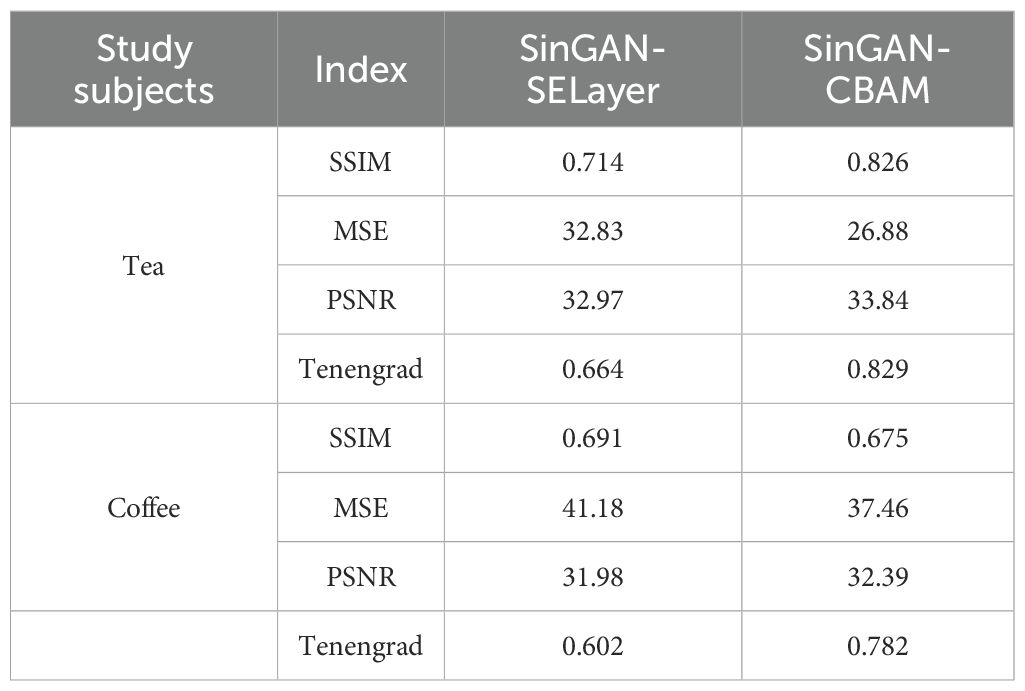 Further aggregating the quantitative metrics of the two improved models, the results are shown in Table 9. In tea leaf image generation, SinGAN-CBAM shows improvements over SinGAN-SE with an increase of 15.7% in SSIM, a decrease of 18.1% in MSE, an increase of 2.6% in PSNR, and an increase of 24.8% in Tenengrad, with all metrics being superior. In coffee images, although SinGAN-SE has a slightly higher SSIM (possibly due to its ability to enhance low-resolution textures), SinGAN-CBAM performs better in terms of MSE (with a decrease of 9.0%), PSNR (an increase of 1.3%), and Tenengrad (an increase of 30.0%).