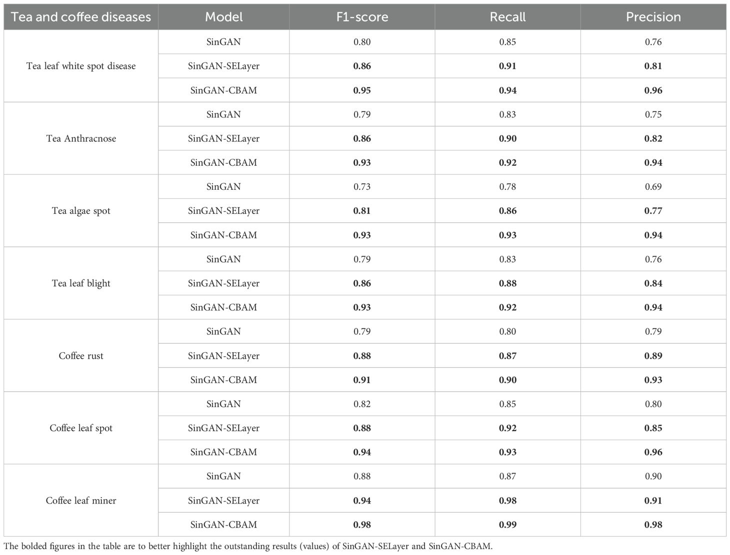 Specifically, across all disease types, SinGAN-CBAM achieved the highest levels of precision, recall, and F1-score. For instance, regarding the coffee leaf miner disease, its precision improved from 0.90 with the original SinGAN to 0.98, with a recall nearing 1.00 and an F1-score reaching 0.98. This indicates that the images generated by this model not only retain critical lesion features but also possess a high degree of semantic consistency, making them accurately identifiable by recognition models. In the case of tea blight, SinGAN-CBAM achieved an precision rate of 0.94, suggesting that the lesions it generates are clear in shape and have distinctive features that are easily recognizable by classifiers.