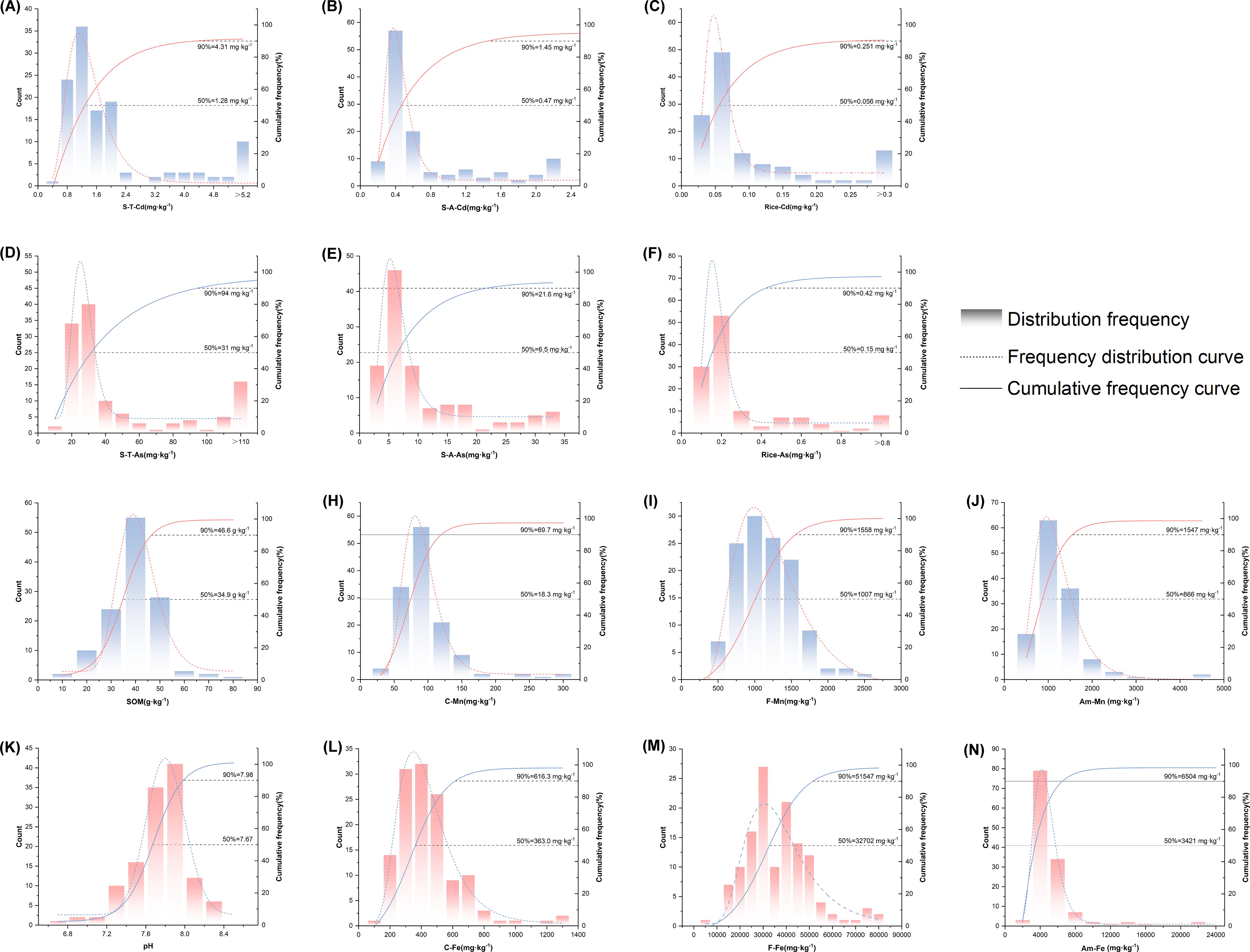 Figure 2. Frequency distribution histograms of soil properties and Cd/As concentrations in soil and rice. (A) Soil total–Cd(S-T-Cd), (B) available–Cd(A-Cd), (C) rice–Cd(Rice-Cd), (D) soil total–As(S-T-As), (F) rice–As(Rice-As), (G) SOM, (H) complex–Fe(C-Fe), (I) free–Fe(F-Fe), (J) amorphous–Fe(Am-Fe), (K) pH, (L) complex–Mn(C-Mn), (M) free–Mn(F-Mn), and (N) amorphous–Mn(Am-Mn).