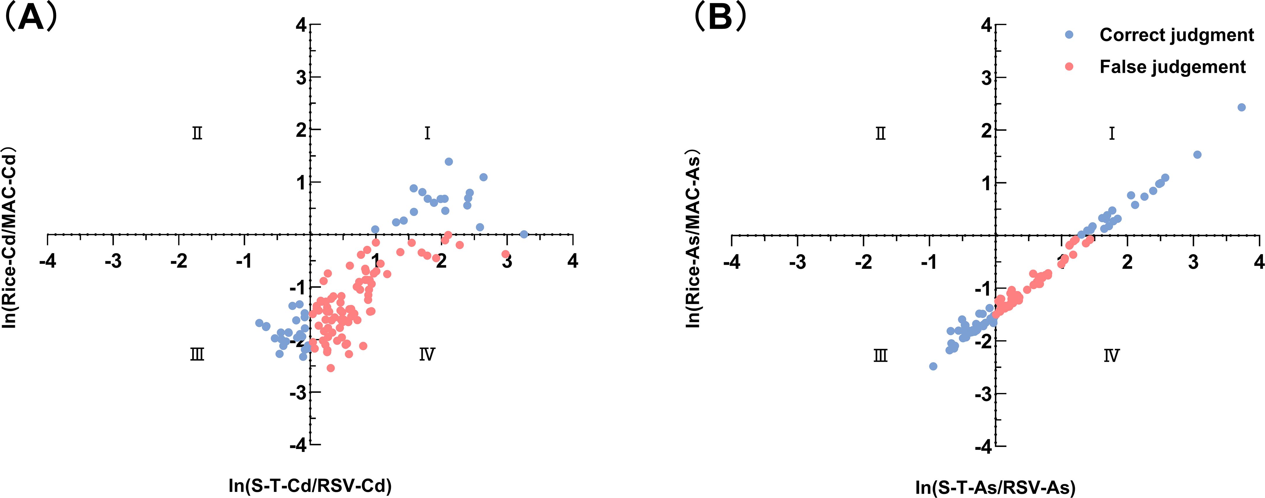 Quadrant (ii): ln(S–T–Cd/RSV–Cd)< 0 and ln(rice–Cd/MAC–Cd) > 0 or ln(S–T–As/RSV–As)< 0 and ln(rice–As/MAC–As) > 0; soil safety, rice insecurity, and RSV unsuitable (false negative).