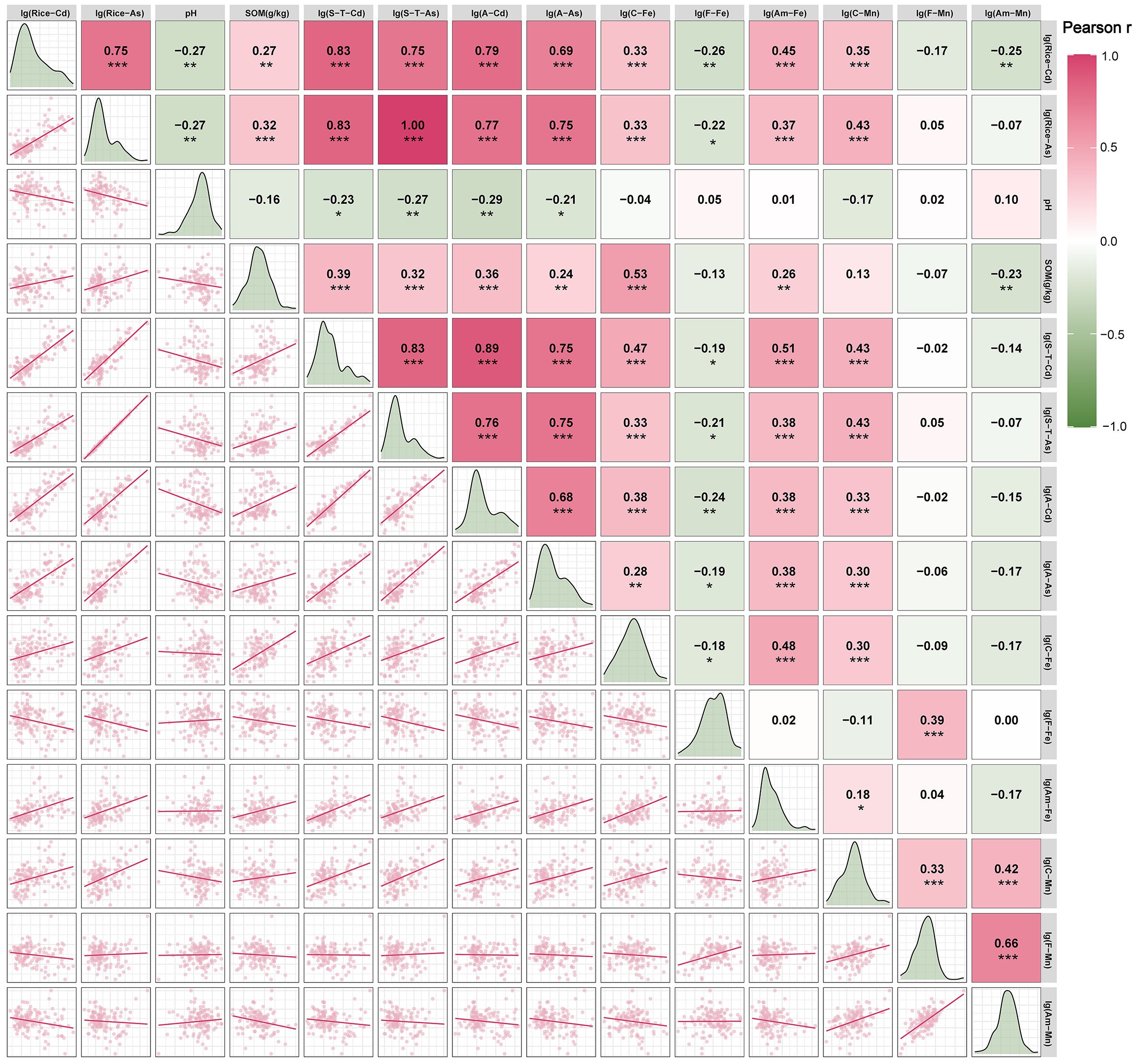Figure 4. Pearson correlation heatmaps of Cd/As concentrations in rice and soil properties. * indicates P< 0.05; ** indicates P < 0.01; *** indicates P < 0.001. The color intensity and value in each cell represent the correlation coefficient. S–T, soil total; A, available; C, complex; F, free; Am, amorphous.