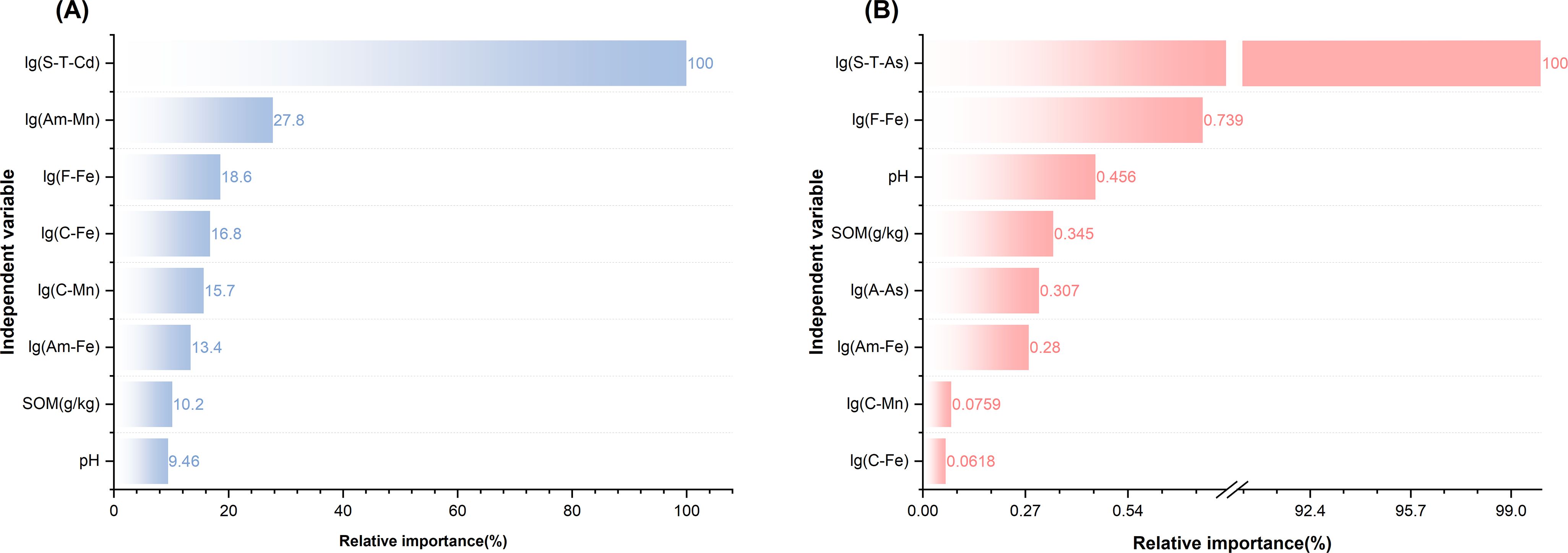 Two bar charts labeled (A) and (B) display relative importance percentages of independent variables. Chart (A) features variables like lg(S-T-Cd) and pH, with lg(S-T-Cd) having the highest importance at one hundred percent. Chart (B) features variables like lg(S-T-As) and lg(C-Fe), with lg(S-T-As) having the highest importance at one hundred percent. Both charts highlight importance differences in a gradient color scheme.