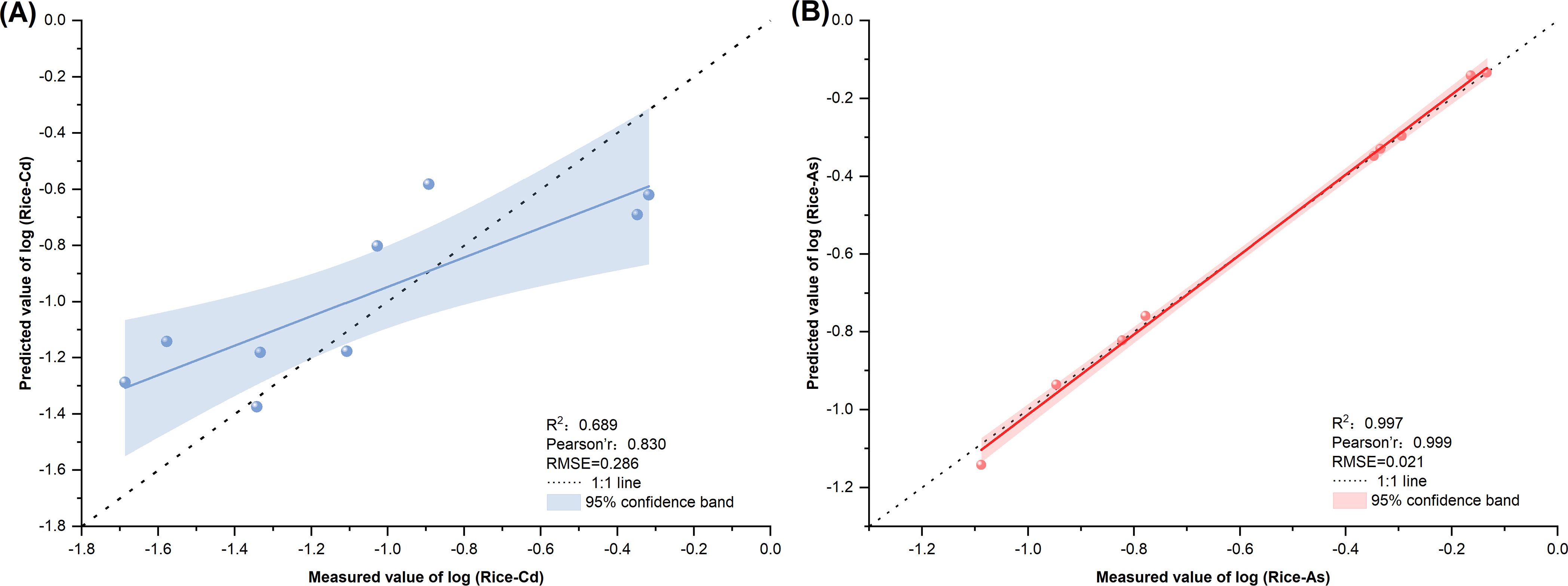 Scatter plots comparing measured and predicted log values. (A) Shows Rice-Cd with a trend line, confidence band, and statistics \(R^2 = 0.689\), Pearson’s \(r = 0.830\), RMSE = 0.286. (B) Shows Rice-As with a similar setup, \(R^2 = 0.997\), Pearson’s \(r = 0.999\), RMSE = 0.021. Both include a one-to-one reference line.