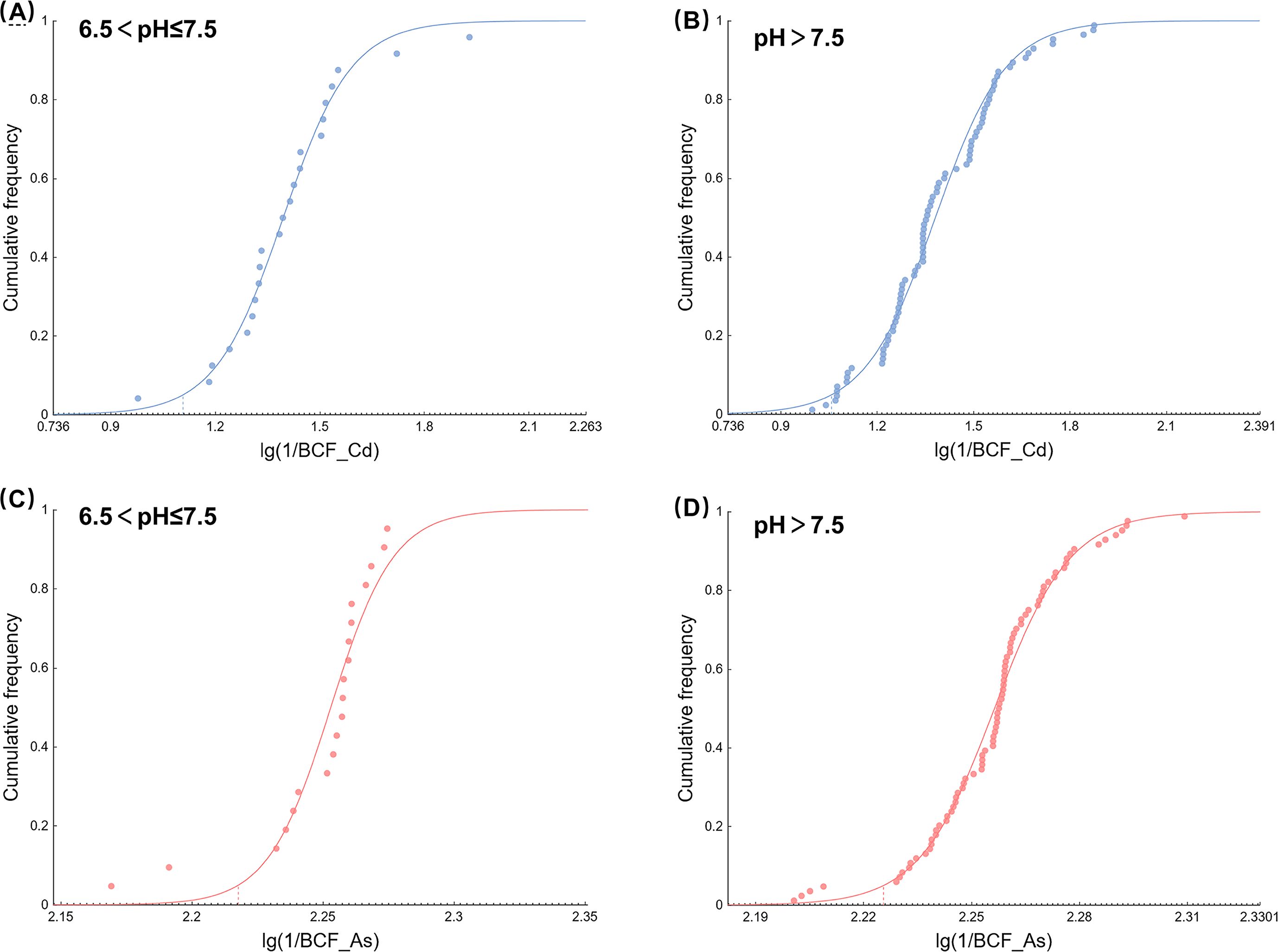 Four cumulative frequency graphs displaying the log-transformed inverse bioconcentration factor (BCF) against environmental pH levels. Graphs A and B show data for Cadmium (Cd) at two pH ranges: 6.5 to 7.5, and above 7.5, respectively. Graphs C and D show data for Arsenic (As) at the same pH ranges. Each graph depicts an S-shaped curve indicating cumulative frequency distribution trends for metal absorption.