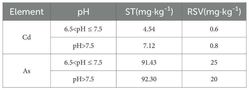 There is a significant positive correlation between the S-T-AS and the A-As (Figure 3, P = 0.75***). By establishing the regression equation for S–T–As (x) and A–As (y) (y=0.721x-0.263, R2 = 0.55, P < 0.05) and considering the linear relationship between S–T–As and A–As, we use S–T–As instead of A–As (That is, A-As=0.721*S-T-As-0.263). In accordance with model(S–T–Cd) and model(S–T–As), the ST–Cd and ST–As of paddy soil are obtained, as shown in Table 2. When 6.5< pH< 7.5, the ST–Cd concentration is 4.54 mg·kg-1, and the ST–As concentration is 91.43 mg·kg-1; when the pH is > 7.5, the ST–Cd concentration is 7.12 mg·kg-1 and the ST–As concentration is 92.30 mg·kg-1. The contents of ST–Cd and ST–As are greater than those of RSV–Cd and RSV–As in paddy fields, and the effects of RSV are stronger for neutral and alkaline paddy soils in karst regions.