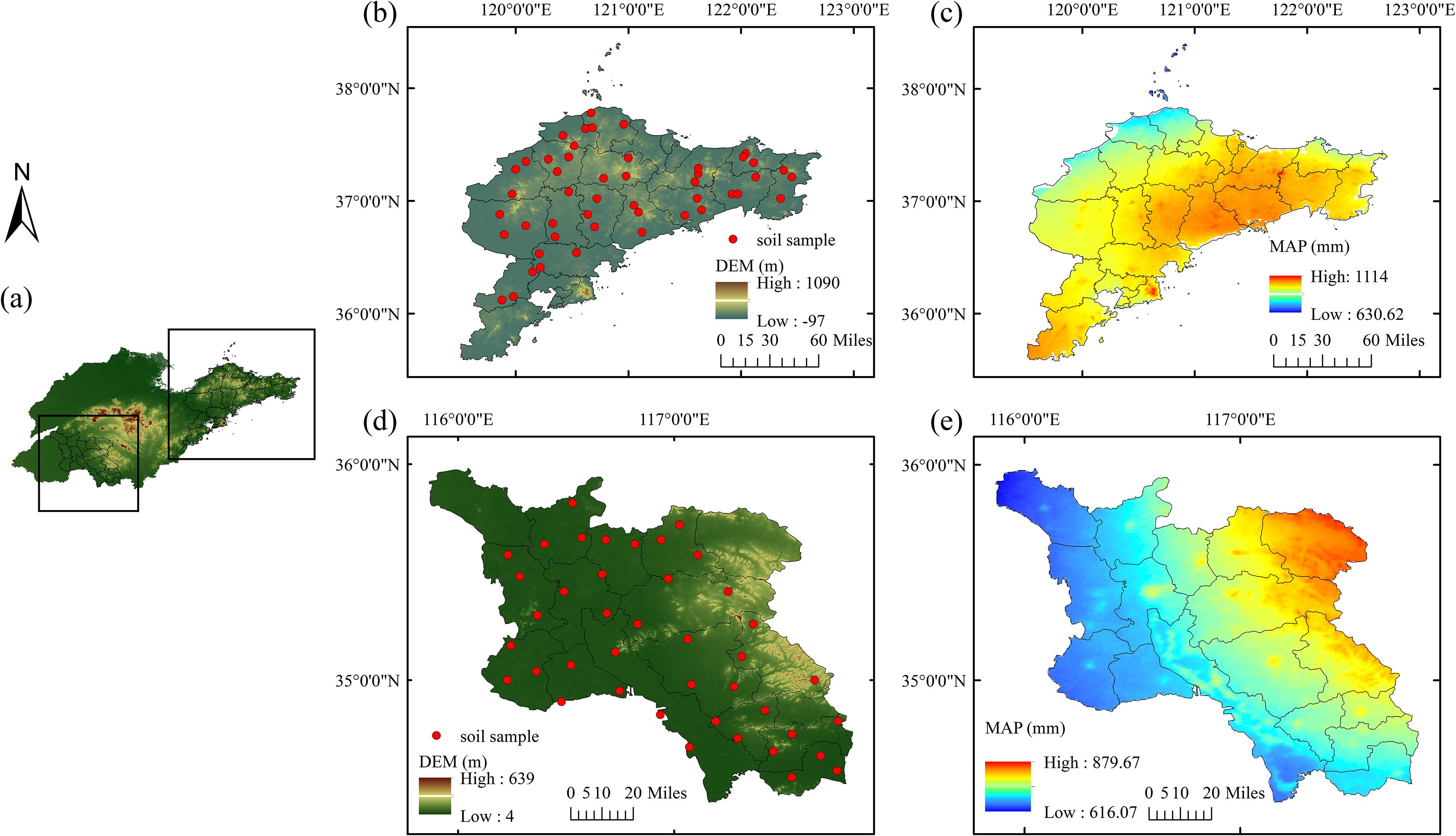 Figure 1. Distribution of sampling sites in the study regions: (a) digital elevation model (DEM) of Shandong Province; (b) sampling locations in the Jiaodong Peninsula, Shandong Province; (c) mean annual precipitation in the Jiaodong Peninsula, Shandong Province; (d) DEM and sampling locations in Southwest Shandong Province; (e) mean annual precipitation in Southwest Shandong Province.
