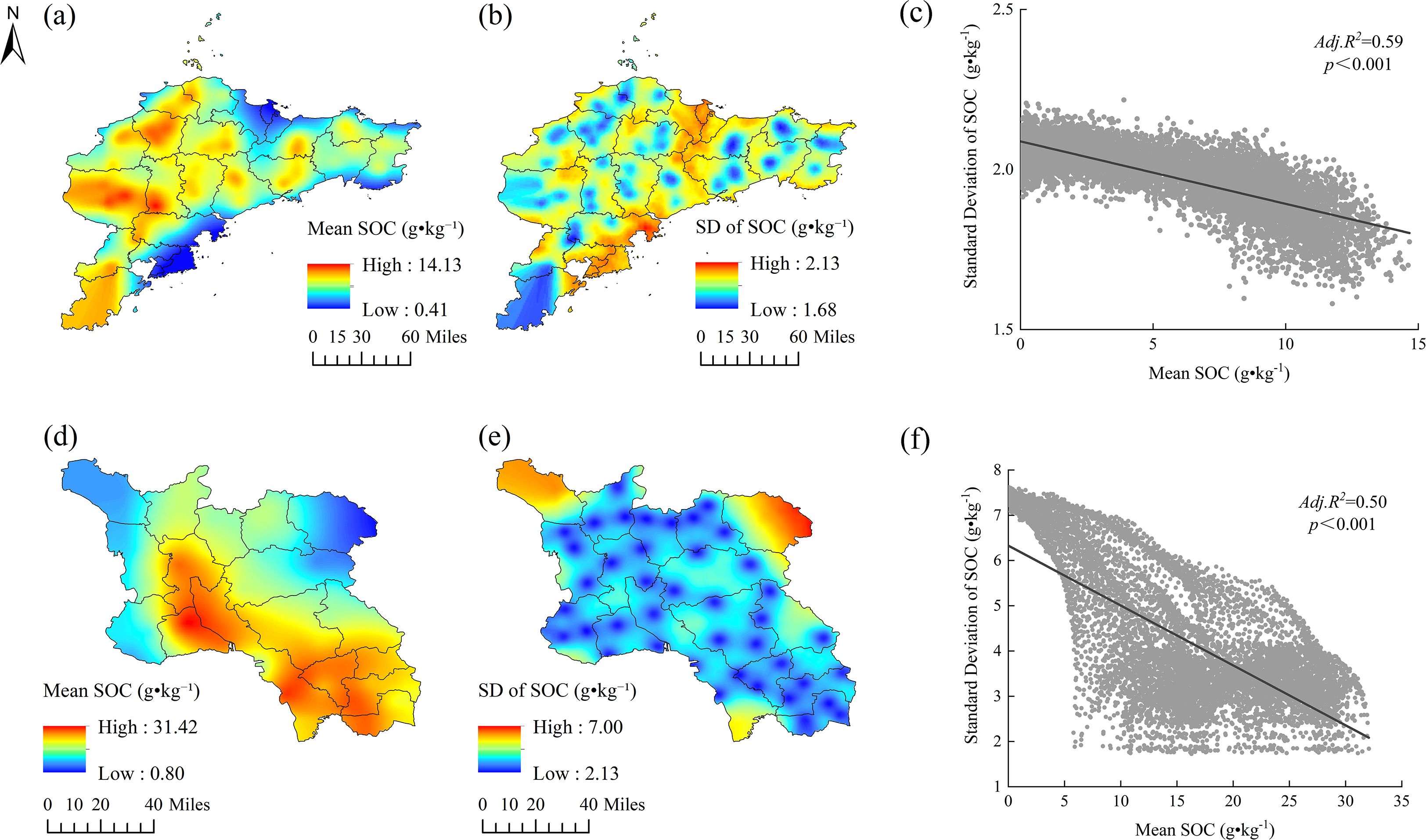 Figure 4. Spatial distribution and statistical relationships of soil organic carbon (SOC) in Shandong Province: (a) mean SOC in the Jiaodong Peninsula derived from ordinary kriging interpolation; (b) standard deviation of SOC in the Jiaodong Peninsula; (c) mean SOC in Southwest Shandong derived from ordinary kriging interpolation; (d) standard deviation of SOC in Southwest Shandong; (e) linear regression between mean and standard deviation of SOC in the Jiaodong Peninsula; (f) linear regression between mean and standard deviation of SOC in Southwest Shandong.