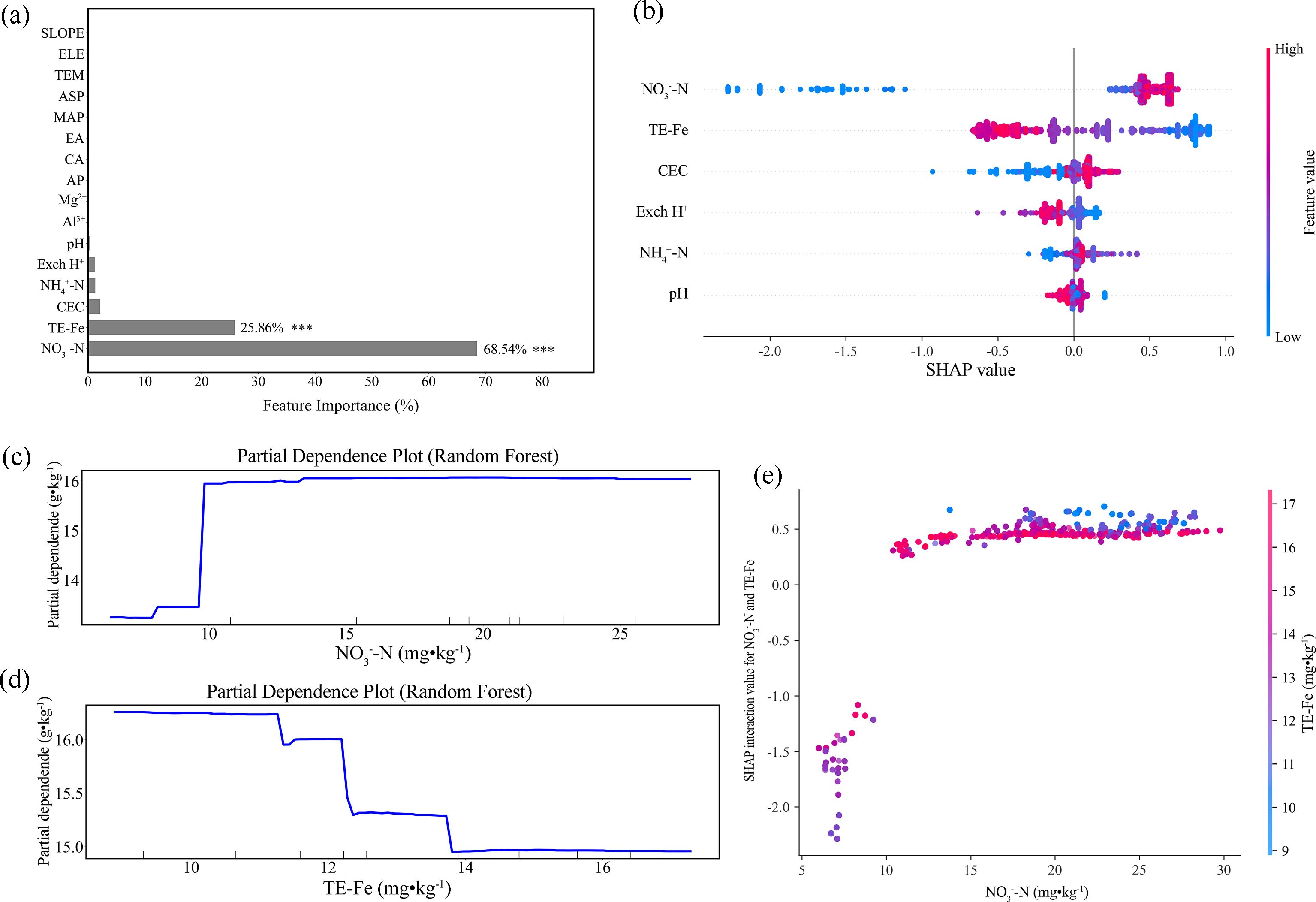 Figure 5. Random forest analysis of the dominant factors controlling soil organic matter in the Jiaodong Peninsula: (a) Variable importance ranking of soil physicochemical properties, indicating nitrate nitrogen (NO3--N) and extractable iron (Fe) as the dominant predictors (***p < 0.001); (b) SHAP summary plot of the random forest model, showing the relative contributions of NO3--N, extractable Fe, cation exchange capacity (CEC), exchangeable hydrogen (Exch H+), ammonium nitrogen (NH4+-N) and hydrogen ion concentration (pH); (c) Partial dependence plot (PDP) illustrating the marginal effect of NO3--N on soil organic matter; (d) Partial dependence plot (PDP) illustrating the marginal effect of extractable Fe on soil organic matter; (e) SHAP interaction values showing the interactive effect between NO3--N and extractable Fe.