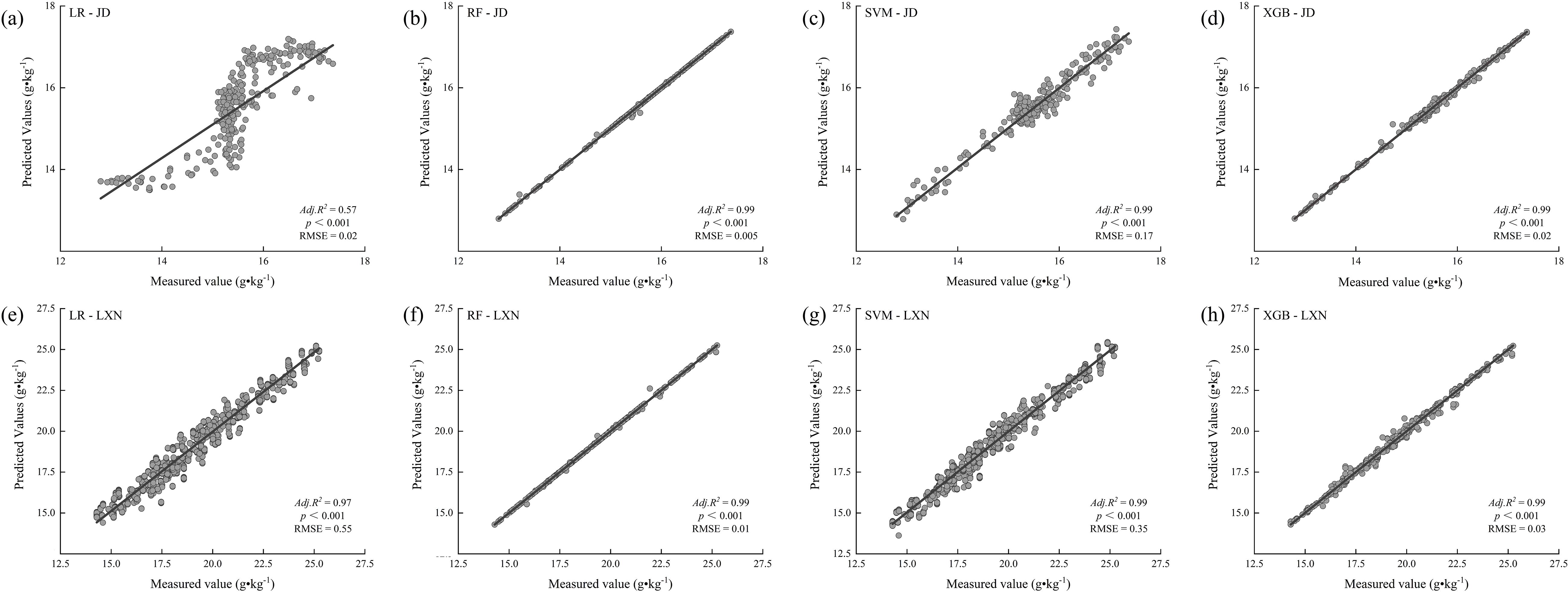 Figure 7. Model-based predictions of soil organic carbon (SOC) using different machine learning algorithms in the Jiaodong Peninsula (JD) and Southwest Shandong (LXN): (a) Linear regression (LR) for the Jiaodong Peninsula; (b) random forest (RF) for the Jiaodong Peninsula; (c) support vector machine (SVM) for the Jiaodong Peninsula; (d) XGBoost (XGB) for the Jiaodong Peninsula; (e) linear regression (LR) for Southwest Shandong; (f) random forest (RF) for Southwest Shandong; (g) support vector machine (SVM) for Southwest Shandong; (h) XGBoost (XGB) for Southwest Shandong.