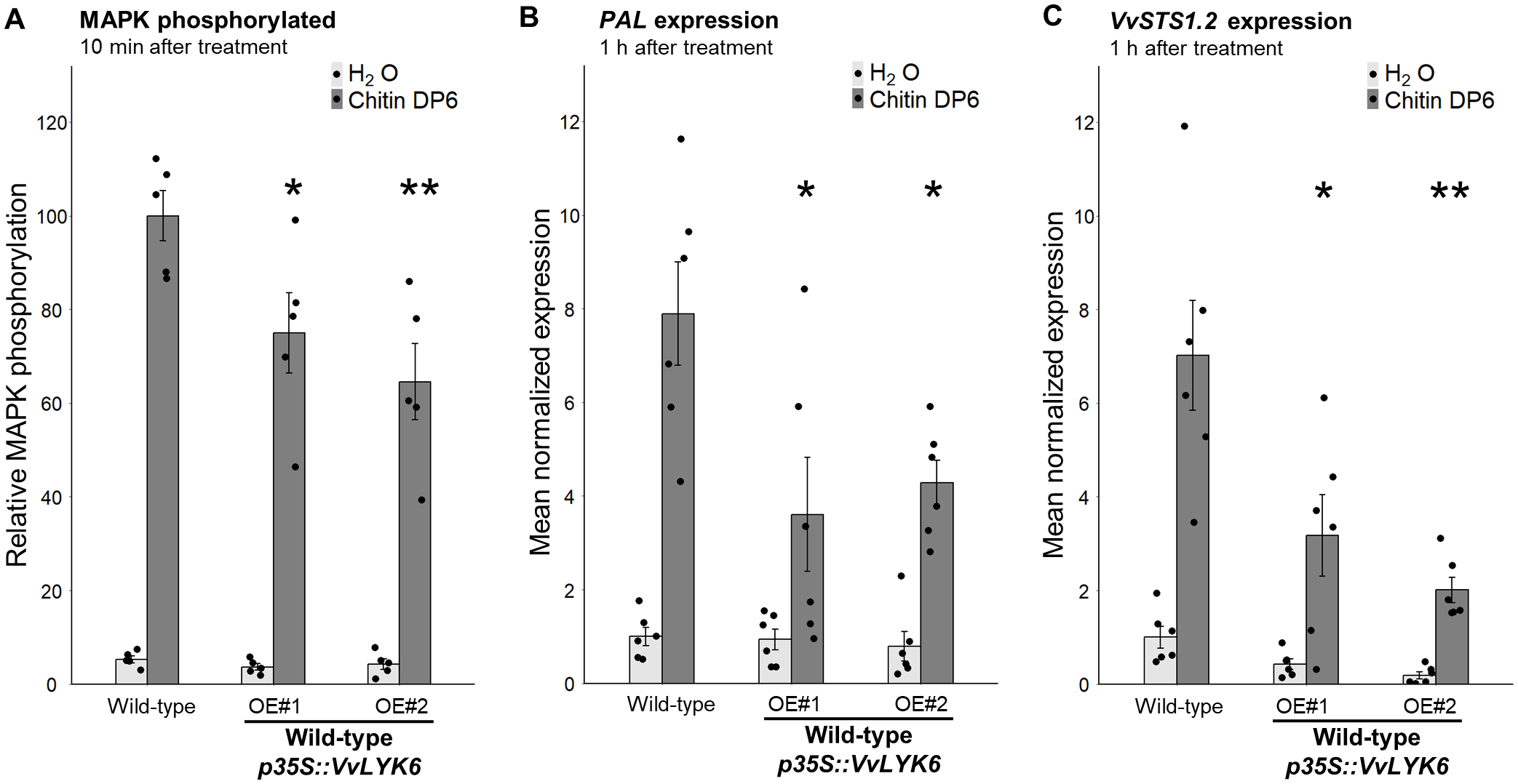 Based on these findings, we conclude that VvLYK6 acts as a negative regulator of chitin-triggered immune responses, suggesting its potential role as a susceptibility gene during fungal infections.