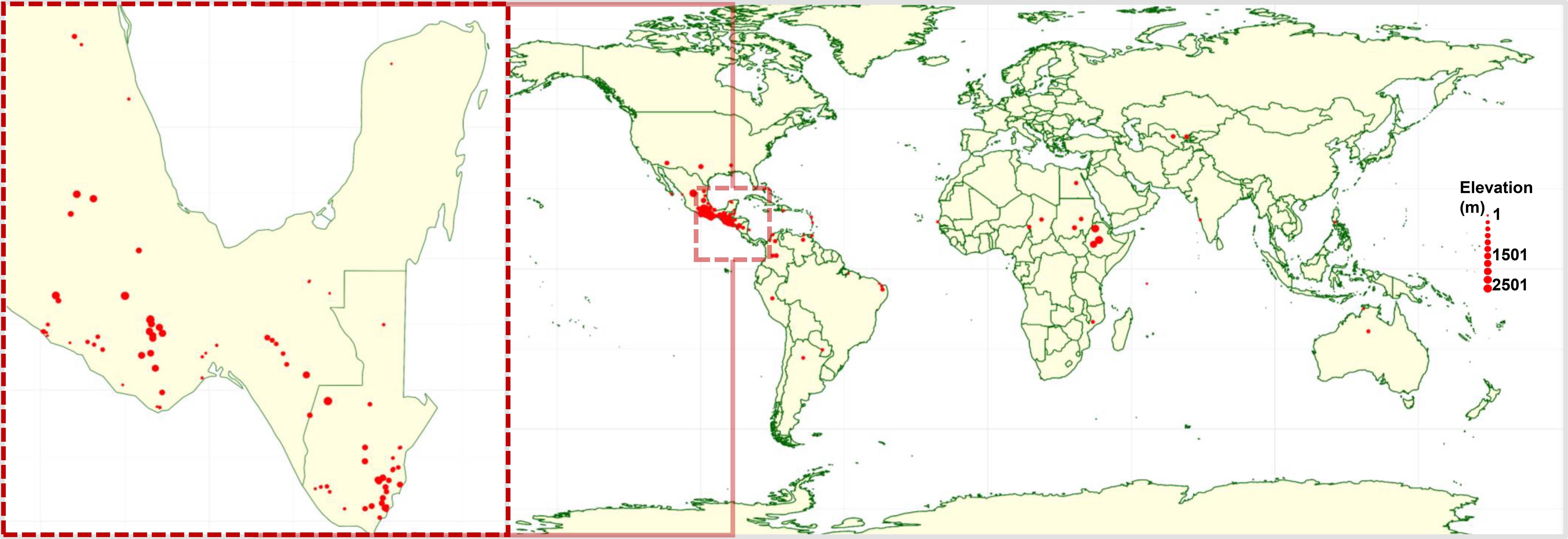 Figure 1. Global geographic distribution of accession in the landrace panel. Each red circle represents a landrace collection site, with circle size corresponding to the elevation of the site, ranging from sea level up to 2,500 meters above sea level.