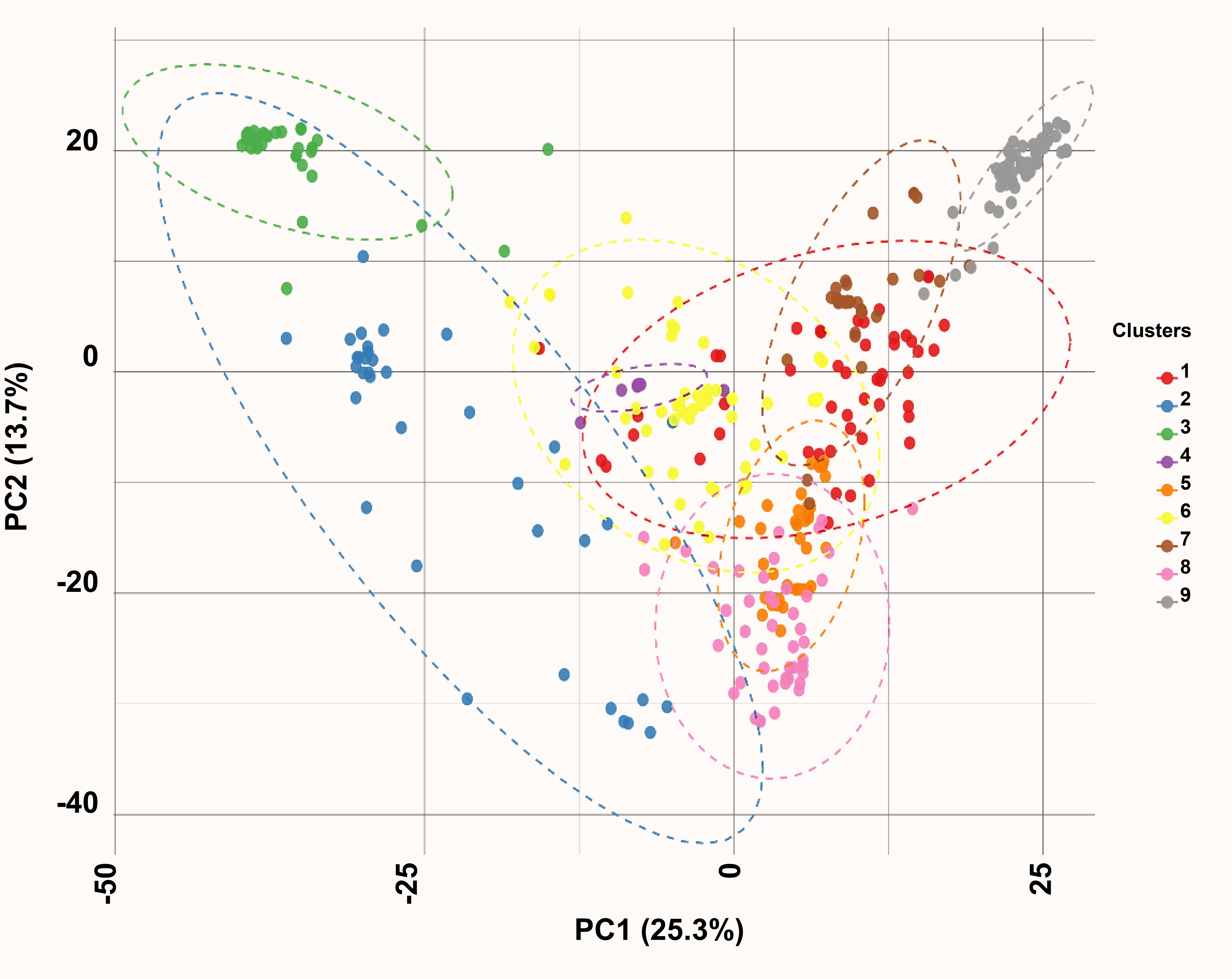 Unsupervised K-means clustering using the first five PCs optimally partitioned the panel into nine genetic groups (K-means Groups I–IX), as determined by the elbow criterion. Group IX consisted predominantly of Central American accessions, especially those from Jalapa and Chiquimula, Guatemala. Groups I, II, and VI were dominated by North-American landraces, whereas Groups III, IV, V, VII, and VIII included accessions from North, Central, and South America, with several Asian accessions intermixed.