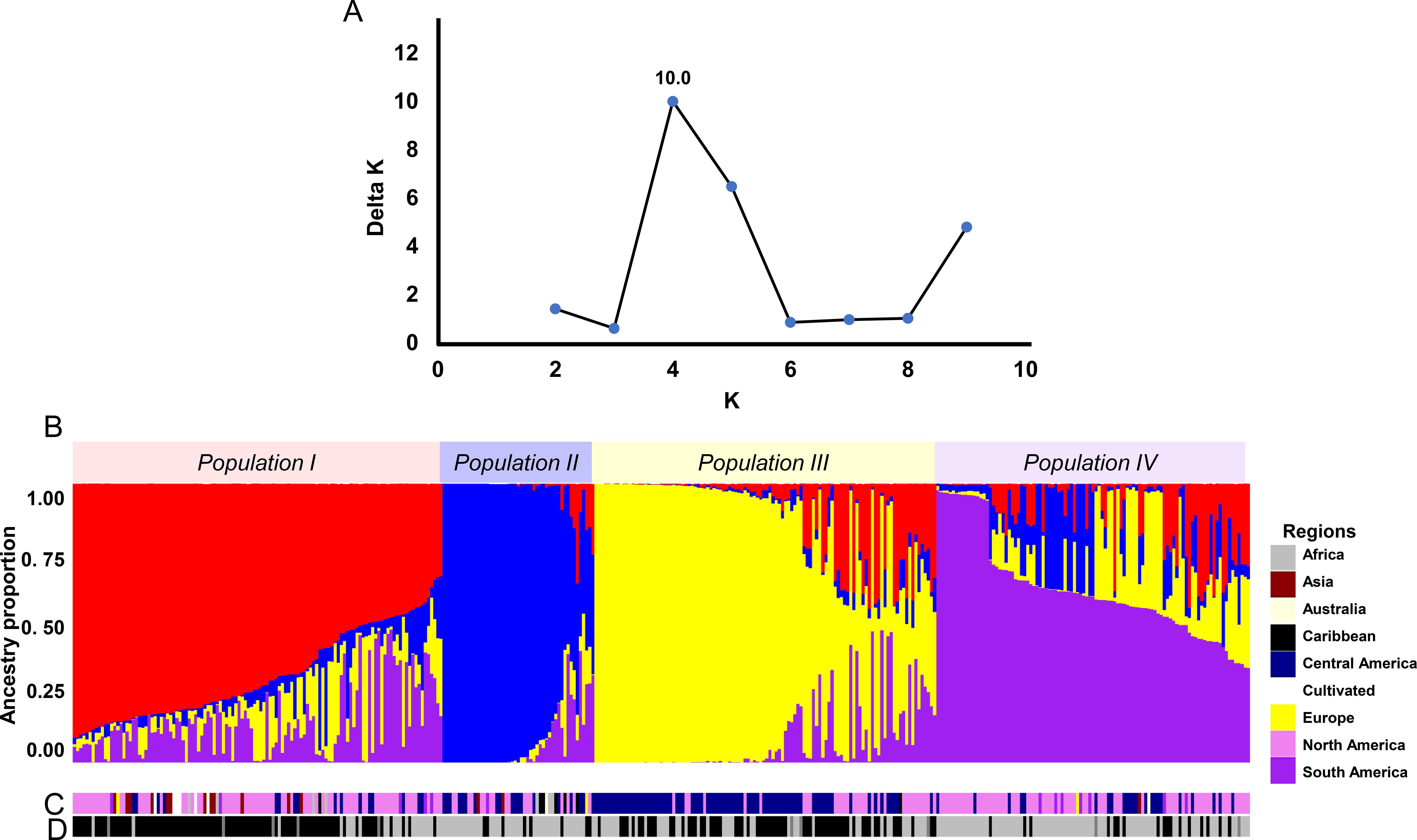 Figure 3. Results of the STRUCTURE analysis. (A) Determination of the optimum number of genetic clusters (K) using the ΔK method, as identified by CLUMPAK. (B) Ancestry proportion plot of individual landraces at K=4, sorted by Q values. (C) Geographic distribution of the individuals in the STRUCTURE population. The inset legend identifies color codes for each population. (D) Photoperiod-sensitivity classification of accessions corresponding to STRUCTURE populations, where black represents photoperiod-insensitive and gray represents photoperiod-sensitive lines.