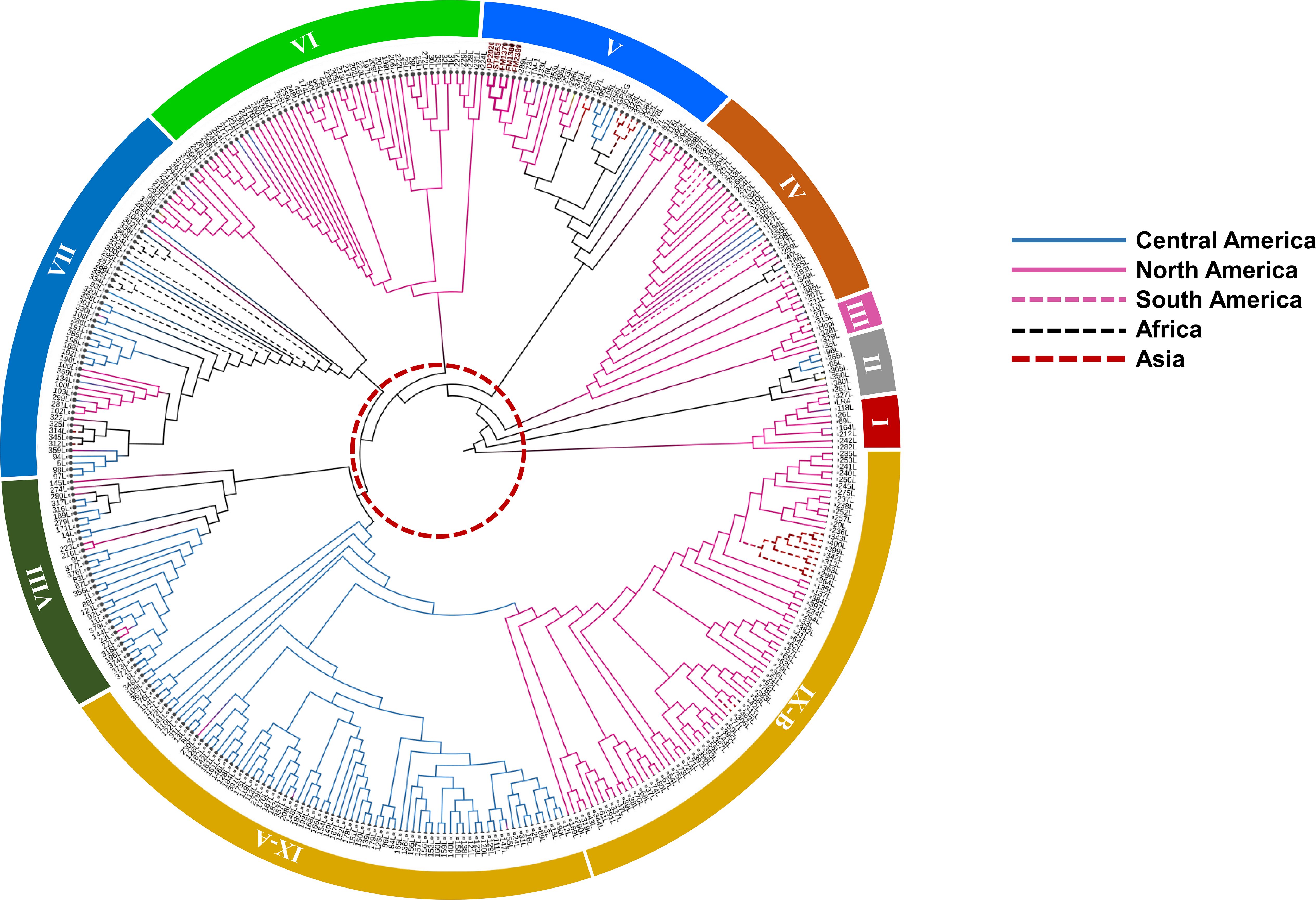 Cluster I consisted of ten Guatemalan and Southern Mexican genotypes, with an average internal divergence of 0.72. Cluster II included seven North American, Central American, and West African genotypes with the highest internal divergence at 0.86 compared to all clusters. Cluster III comprised five genotypes from northern and central regions of the Americas, with a divergence of 0.76. Cluster IV grouped 33 accessions from North, Central, and South America, as well as one from Seychelles, and showed a divergence of 0.71. Cluster V contained 35 genotypes, including all cultivated varieties along with TM-1 and several US landraces. Genotypes in this cluster had the lowest internal divergence at 0.61. Cluster VI was composed of 49 landraces originating from the highlands of Oaxaca, Guerrero, and Chiapas in Mexico, as well as parts of Guatemala and El Salvador, with an average divergence of 0.68. Cluster VII was geographically diverse, encompassing 51 genotypes from Central America, North America, Africa, Asia, and the Caribbean, and showed internal divergence of 0.76. Cluster VIII included 34 accessions largely from the Guatemalan highlands, along with one from Australia, with an internal divergence of 0.83. Cluster IX was the largest, containing 153 accessions from North America, Central America, Asia, and the Caribbean. This cluster was further subdivided into Cluster IX-A and B. IX-A is composed of Central American genotypes with a divergence value of 0.58, whereas IX-B consisted mostly of North American and Asian genotypes with divergence of 0.67.