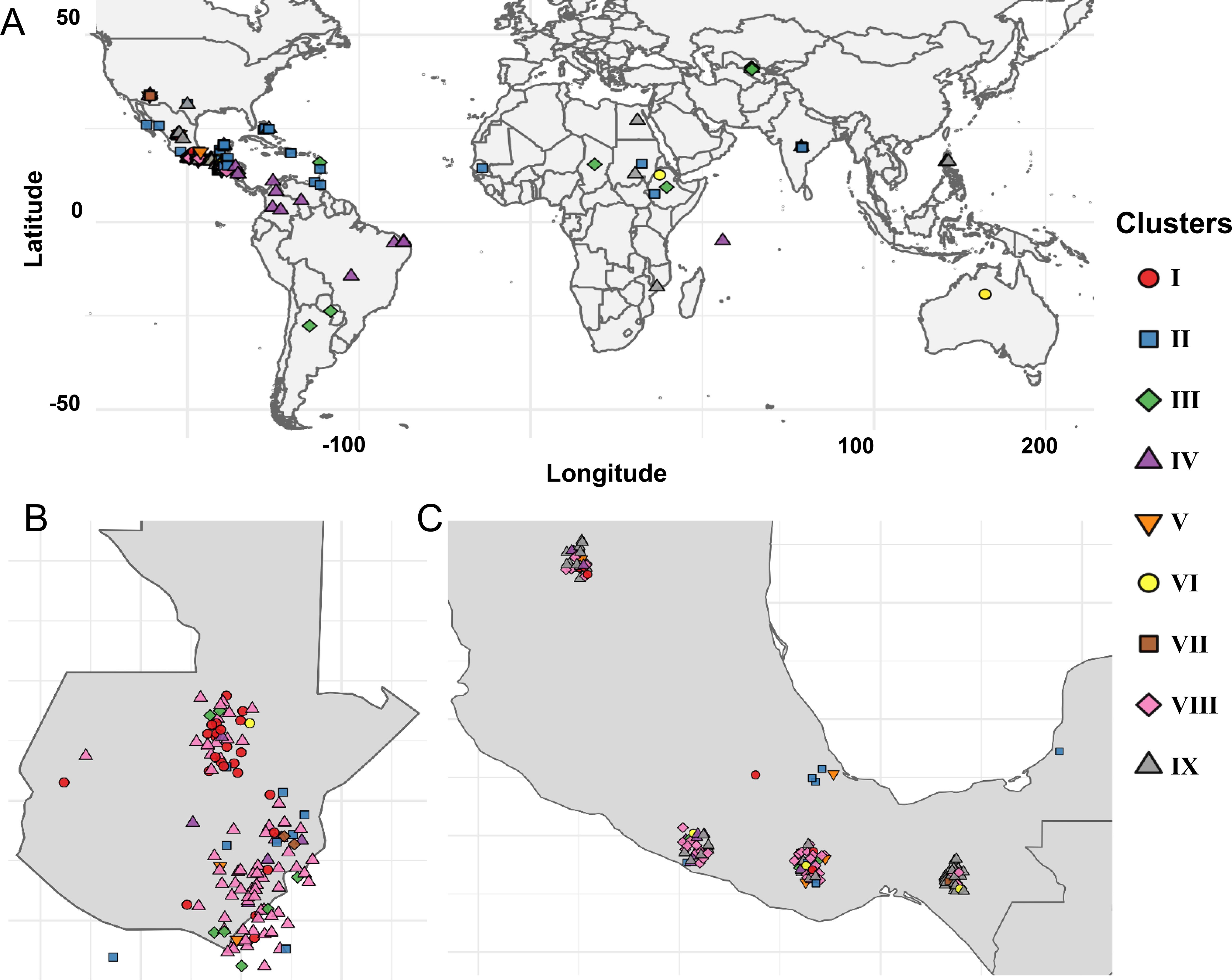 Figure 5. Spatial distribution of cotton landraces across geographic regions. (A) Global map showing landrace locations, with color and shape codes representing clusters identified through Neighbor-Joining analysis. Zoomed-in view of landraces originating from Guatemala (B) and Mexico (C).