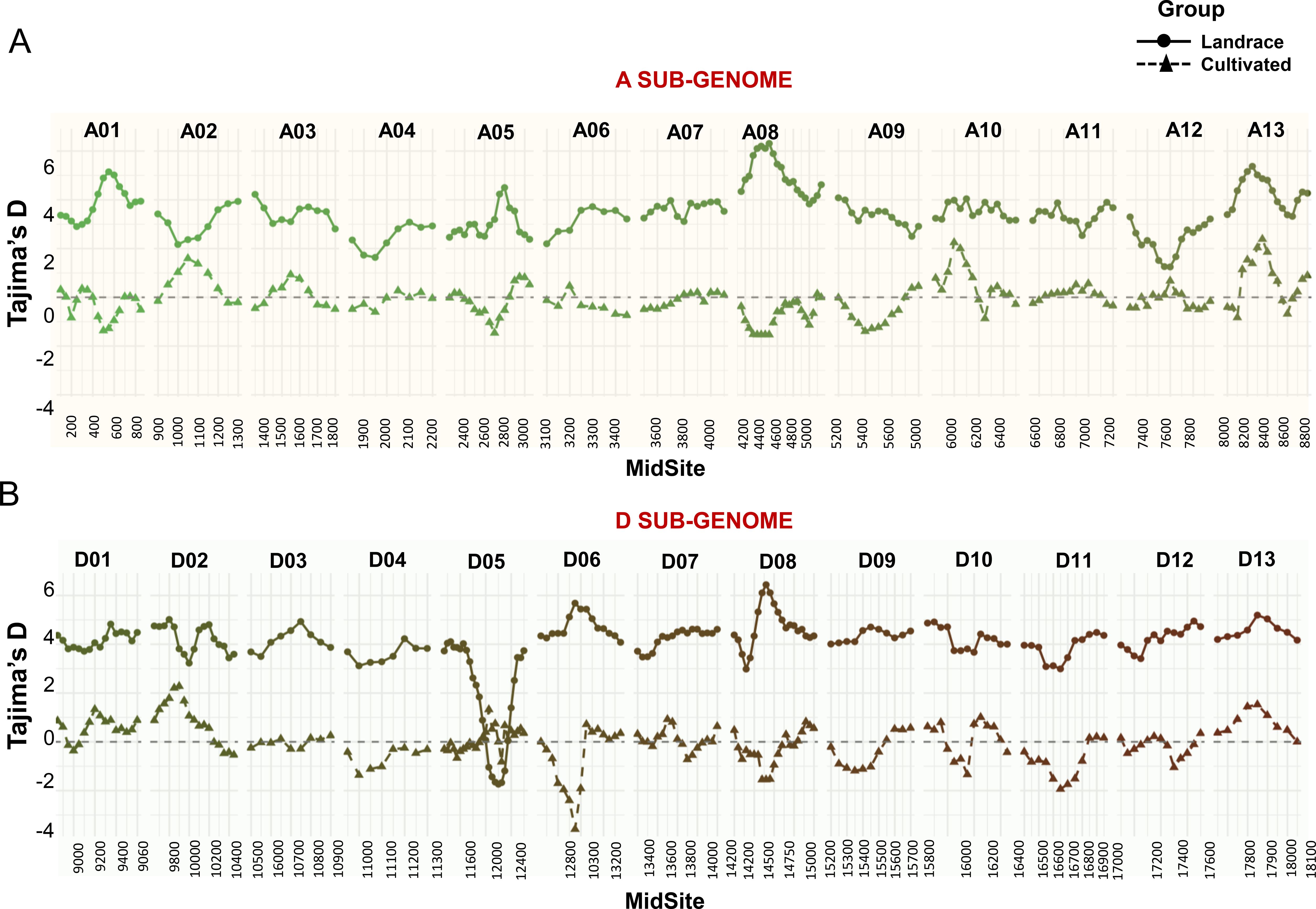 Figure 6. Chromosome-wise estimation of Tajima’s D values for the cotton landrace panel and cultivated germplasm. The values for sub-genomes A (A) and D (B) were calculated using sliding windows of 50 SNPs with a 200 bp step size. MidSite represents the physical midpoint of each SNP-defined window. A0-A13 and D01-D13 represent thirteen chromosomes in the A and D sub-genomes, respectively.