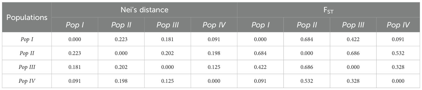Nei’s genetic distance analysis showed the greatest divergence between Populations I and II (0.2231), followed by Populations II and III (0.2018) (Table 1). Pairwise FST estimates were highest between Populations I and II (FST = 0.684) and between Populations II and III (FST = 0.686). In contrast, Populations I and IV exhibited relatively low differentiation (FST = 0.0909) (Table 1).