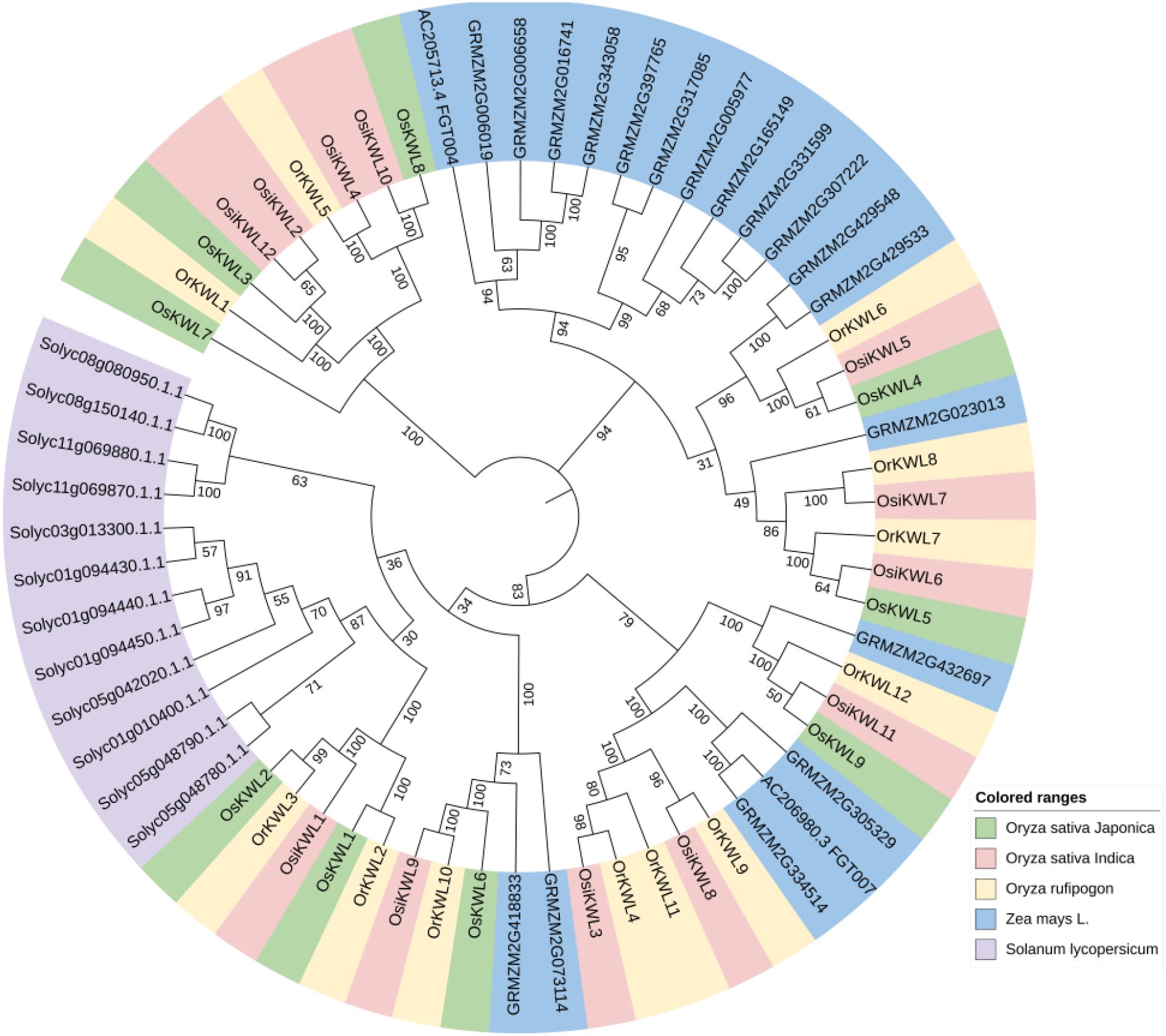 Figure 1. Phylogenetic tree of KWL members from three rice species, Solanum lycopersicum and Zea mays, constructed using the neighbor-joining method (1000 bootstrap replicates). In the phylogenetic tree, homologous members across species are color-coded uniformly.