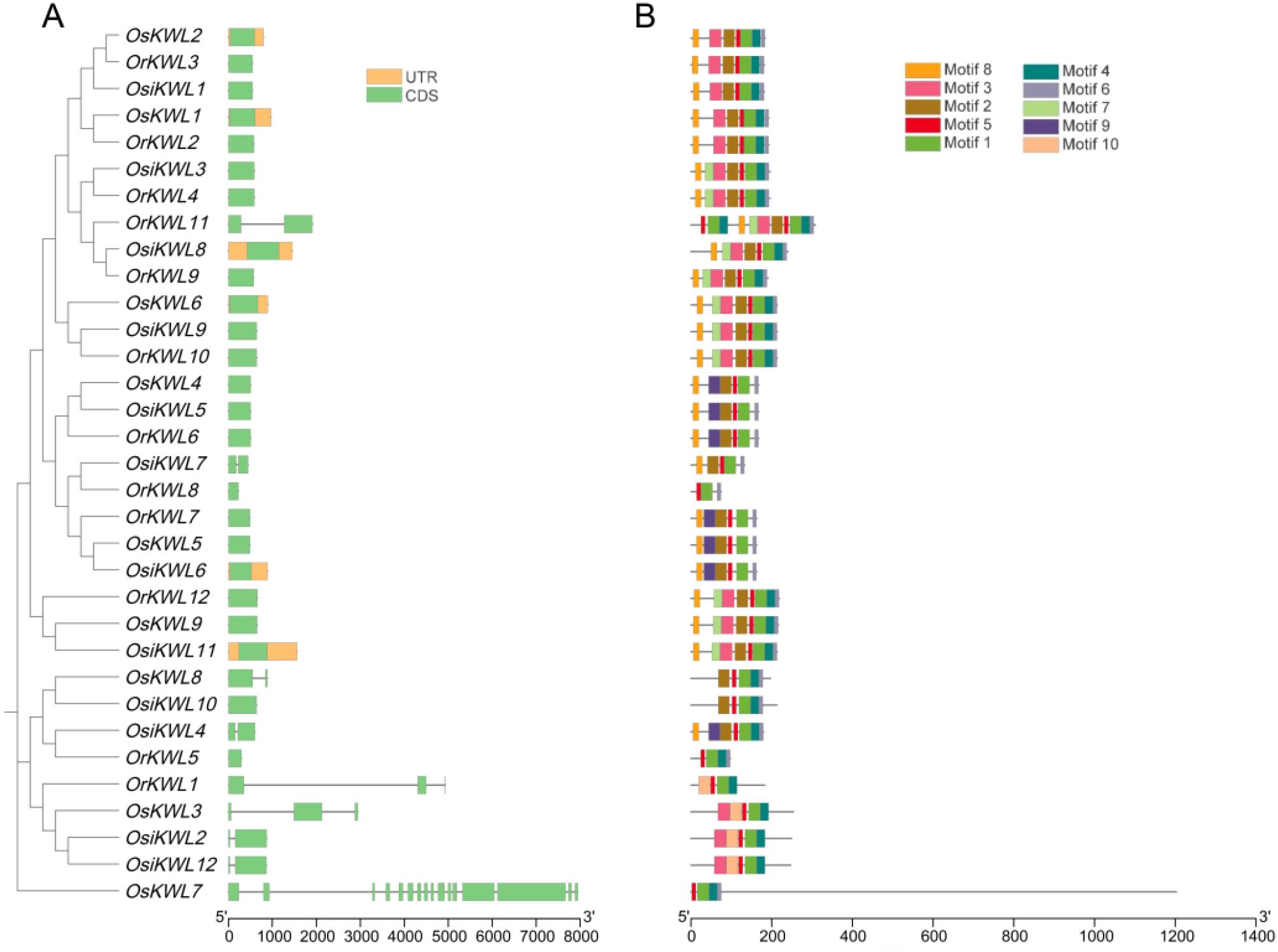 Figure 2. The gene structure and conserved protein motif of KWLs in three rice species. (A) Evolutionary analysis of KWLs, and gene structure visualization of KWLs in Os, Osi, and Or. (B) conserved motif visualization.
