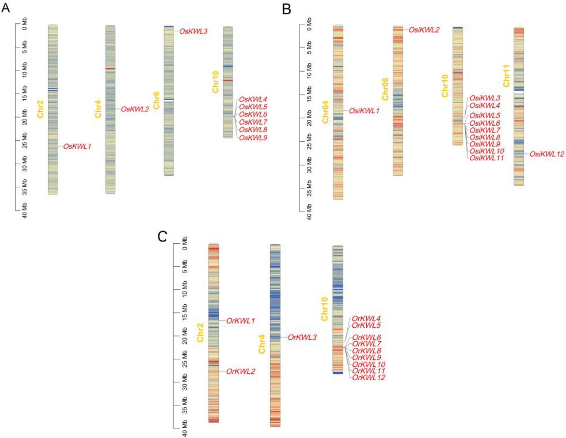 Figure 3. Chromosomal distribution of KWL genes in the three rice species. (A) Oryza sativa ssp. japonica. (B) Oryza sativa ssp. indica. (C) Oryza rufipogon. Gene density per chromosome was calculated using a sliding window of 200 kb. The color gradient from blue to red represents low to high gene density, respectively.