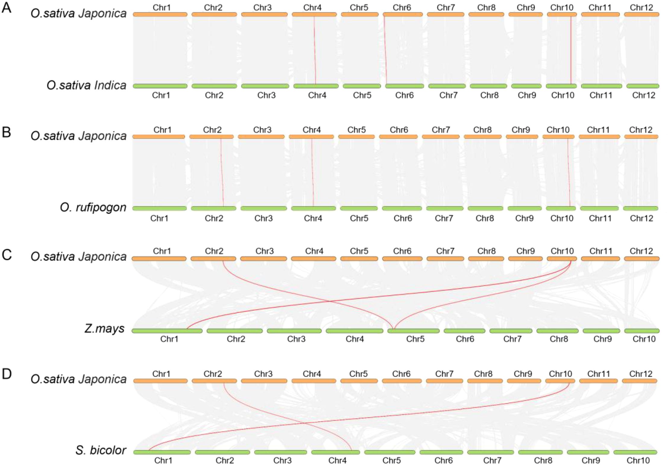 Figure 4. Synteny analysis of KWL genes among O. sativa Japonica, O. sativa Indica, O. rufipogon, Z. mays, and S. bicolor. (A) O. sativa Japonica vs. O. sativa Indica. (B) O. sativa Japonica vs. O. rufipogon. (C) O. sativa Japonica vs. Z. mays. (D) O. sativa Japonica vs. S. bicolor. Each small short line represents a chromosome. The gray lines represent all collinear gene pairs between genomes, while the red lines indicate collinear relationships specifically between KWL genes across species.