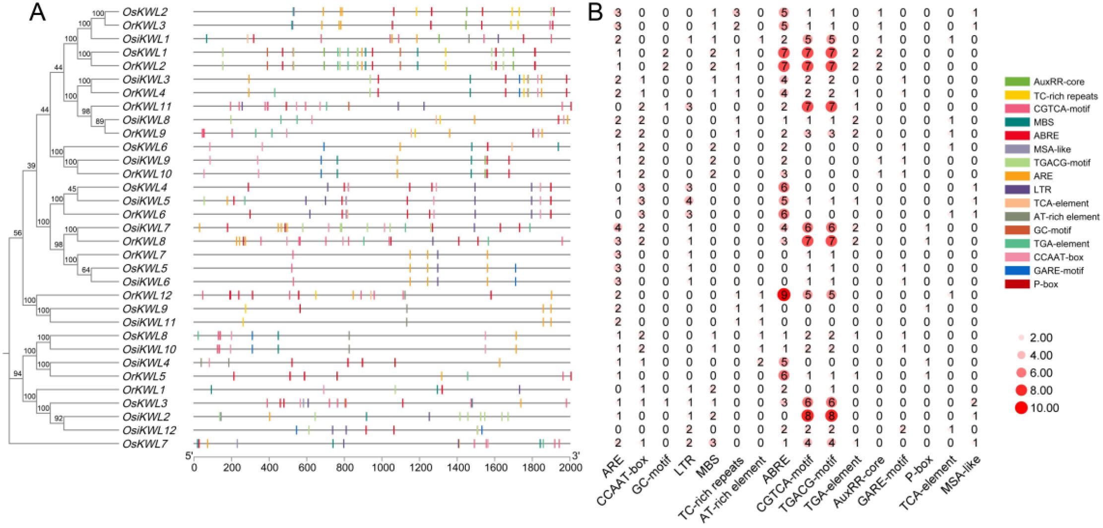 Figure 5. Visualization analysis of cis-acting elements in the promoter region of the KWL gene in three Oryza species. (A) Cis-acting elements were identified in the 2.0 kb upstream promoter regions of KWL genes. All depicted elements are located on the positive strand. (B) The numbers in the heatmap indicate the abundance of the corresponding cis-acting elements.