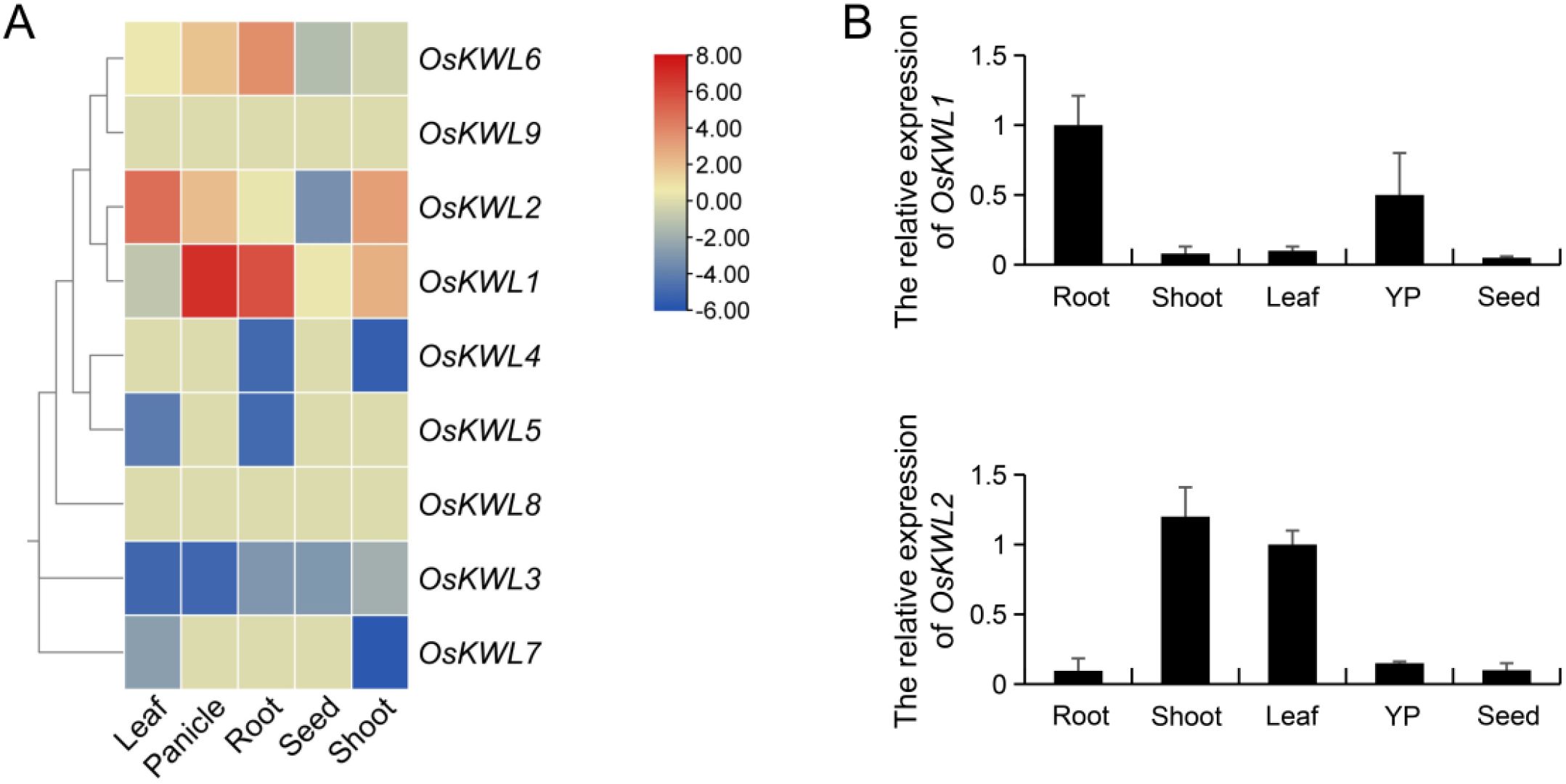Figure 6. Expression pattern of OsKWL genes. (A) Expression analysis of the OsKWLs in different tissues. The heatmap was created based on the log2(FPKM) value of OsKWLs. Differences in gene expression are colored, with red for high expression and blue for low expression. (B) qRT-PCR analysis of OsKWL1 and OsKWL2 in different tissues, including the root, shoot, leaf, young panicle (YP) and seed. OsActin was used as the control, and all values are means ± SD of three biological replicates.
