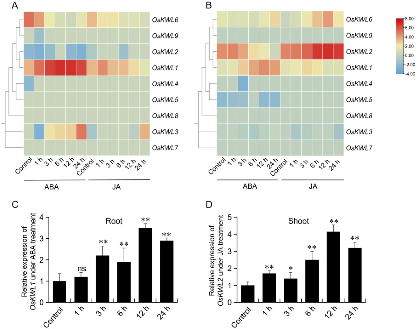 Figure 7. Expression analysis of OsKWL genes under hormone treatments. (A, B) Expression profiles of OsKWLs in roots (A) and shoots (B) following ABA and JA treatments. Data were obtained from the Rice RNA-seq Database. (C, D) Expression analysis of OsKWL1 in roots after ABA treatment and OsKWL2 in shoots after JA treatment was performed using qRT-PCR, with OsActin as the reference gene for normalization. All values are means ± SD of three biological replicates. ns, no significant differences; *P < 0.05; **P < 0.01 by Student’s t-test.