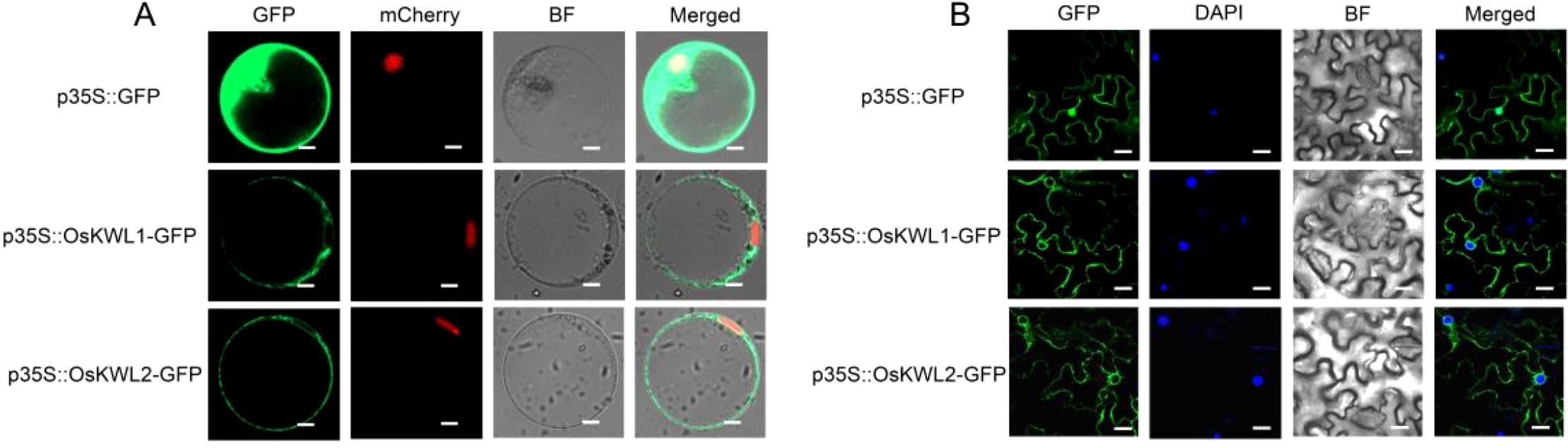 Figure 8. Subcellular localization of OsKWL1 and OsKWL2. (A) Subcellular localization of OsKWL1 and OsKWL2 observed in rice protoplasts. The DWARF 53-mCherry fusion protein serves as a nuclear localization marker. Scale bar, 5 μm. (B) Subcellular localization of OsKWL1 and OsKWL2 observed in N. benthamiana leaves. Scale bar, 20 μm.