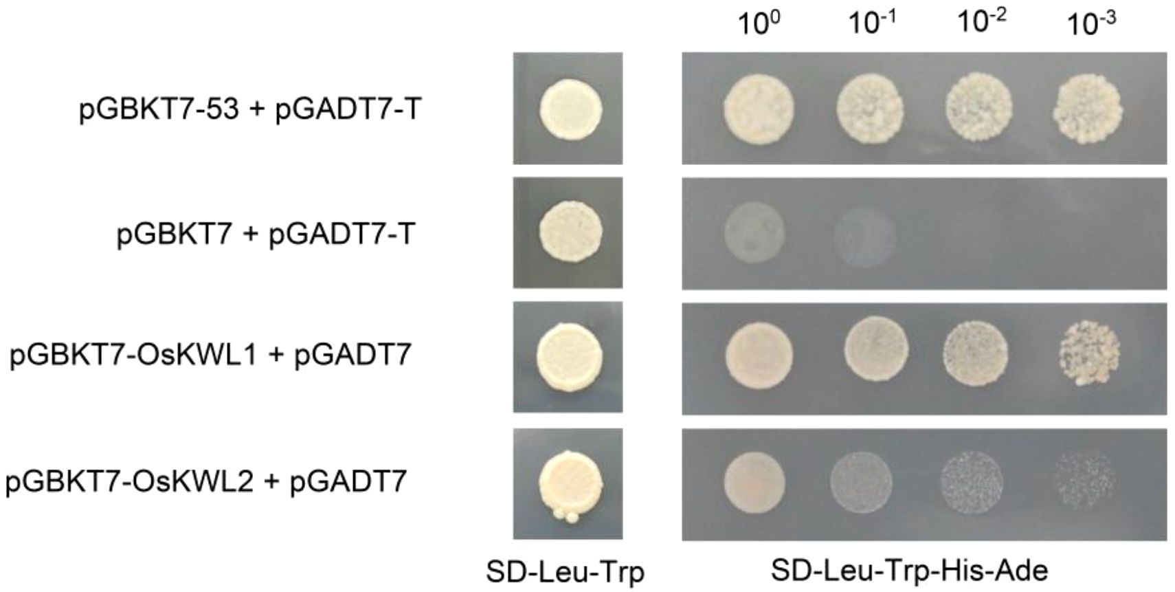The Y2H system was used to verify self-activation activity. The CDS of OsKWL1 and OsKWL2 were cloned into the pGBKT7 vector and co-transformed with the pGADT7 vector into the Y2HGold yeast (Saccharomyces cerevisiae) strain. The transformed yeast cells were plated on SD/-Leu-Trp medium and incubated upside down in a 30°C incubator for approximately 3 d. The combinations pGBKT7-53+pGADT7-T and pGBKT7+ pGADT7-T were used as positive and negative controls, respectively. Single colonies were subsequently selected and transferred onto SD/-Leu-Trp/-His/-Ade medium for further cultivation and observation. The primers used are listed in Supplementary Table S3.