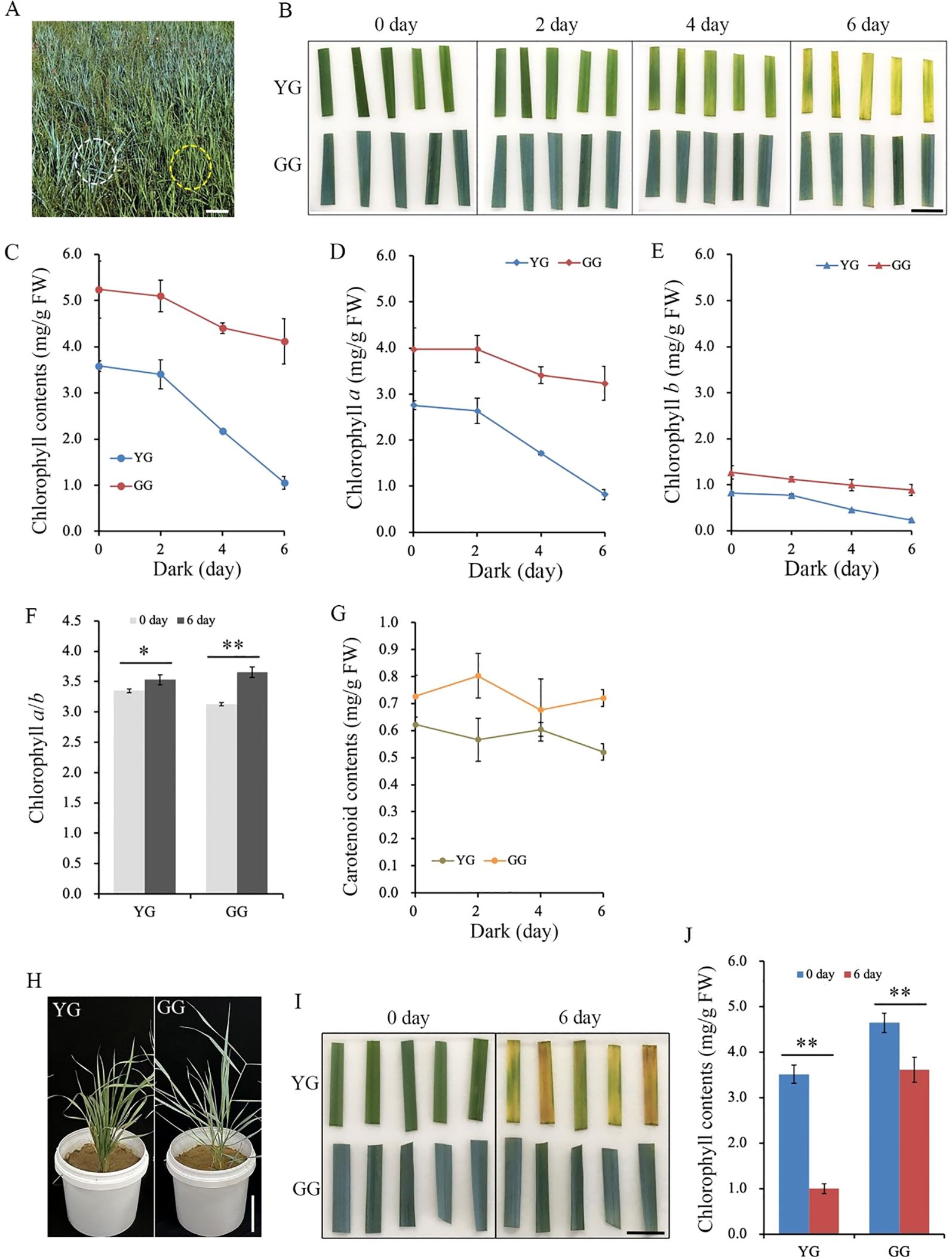 Composite image showcasing multiple panels related to plant study. Panel A shows plants with regions highlighted. Panel B presents leaf samples from two groups (YG and GG) over six days in darkness, showing color changes. Graphs C to G depict changes in chlorophyll and carotenoid contents, comparing YG and GG over time: C shows total chlorophyll, D shows chlorophyll a, E shows chlorophyll b, F compares chlorophyll a/b ratio at different days, G shows carotenoid contents. Panel H shows photos of two plant groups in pots. Panel I contains leaf samples at day zero and six. Panel J graphically compares chlorophyll content on day zero and six for both groups.