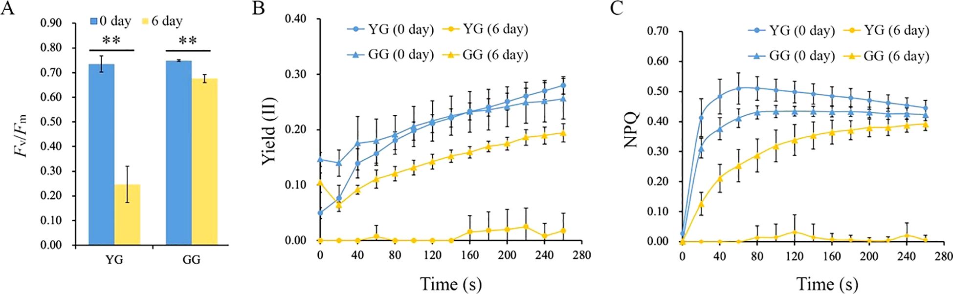 Three charts labeled A, B, and C. Chart A shows bar graphs comparing Fv/Fm values for YG and GG over 0 and 6 days, with higher values at 0 day marked by asterisks. Chart B is a line graph showing Yield (II) for YG and GG, both 0 and 6 days, where YG has higher values over time. Chart C plots NPQ, with YG showing a rapid increase initially, while GG shows lower NPQ values over time. Error bars are present in all graphs.