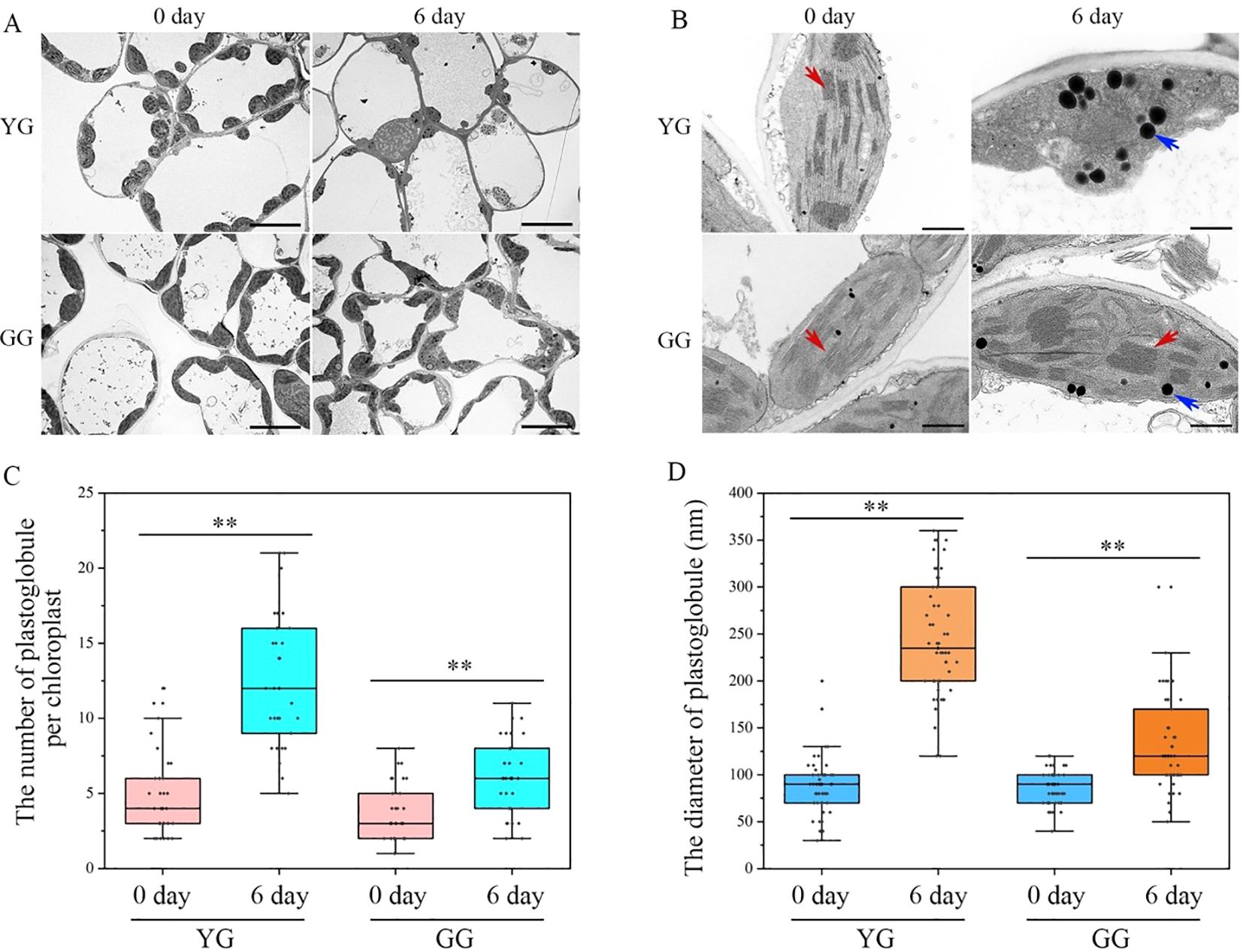 Figure 3. The transmission electron microscopies of chloroplasts in YG and GG. (A) The chloroplasts observed in the cells of YG and GG leaves. (B) The representative images of chloroplasts from YG and GG. The blue arrowheads indicate globular structures, and the red arrowheads denote thylakoid membranes. Bars=10.0 µm (A); bars=1.0 µm (B). (C) The quantitative analysis of plastoglobules within each chloroplast. Thirty chloroplasts from each sample were employed for the quantification of plastoglobules. (D) The variation in the size of plastoglobules within chloroplasts. A total of fifty plastoglobules derived from different chloroplasts were analyzed for their diameters. The error bars indicate S.D. Asterisks denote significant differences (One-way ANOVA, ** P<0.01). YG, yellow–green Leymus chinensis. GG, gray–green Leymus chinensis.