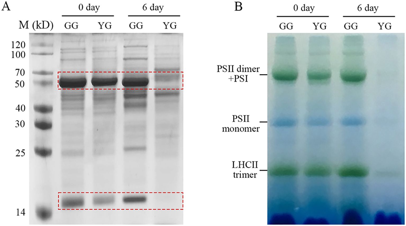 Figure 4. Soluble and thylakoid membrane proteins of GG and YG leaves in darkness. (A) Separation of soluble proteins using SDS–PAGE. The dashed rectangles mark the large and small subunits of Rubisco, respectively. (B) Characterization of thylakoid membrane proteins from GG and YG with blue-native PAGE. The samples were loaded on the base of equal fresh weight of GG and YG leaves for both gel analysis. YG, yellow–green Leymus chinensis. GG, gray–green Leymus chinensis.