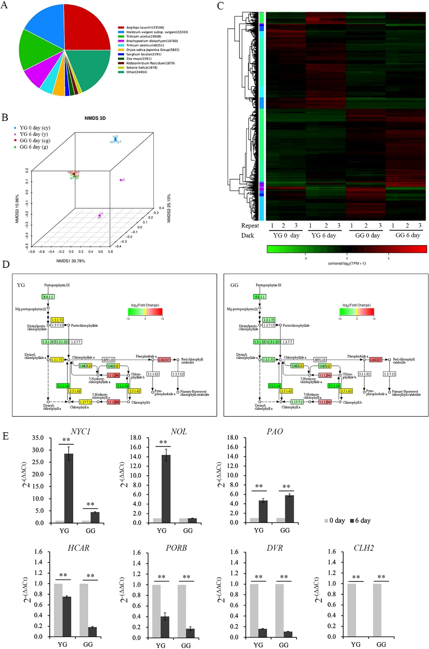 Figure 5. Transcription of genes involved in chlorophyll metabolism in YG and GG under dark conditions. (A) Similar species of Leymus chinensis identified through transcriptome analysis. (B) NMDS analysis comparing different groups of Leymus chinensis samples. (C) Heatmap illustrating the transcriptional activity of YG and GG before and after dark treatment. (D) Partial pathway maps of chlorophyll metabolism derived from KEGG analysis. The different colors of the rectangular boxes indicate variations in transcription: red signifies increased transcription, green denotes decreased expression, yellow indicates no significant changes in transcription level, and white suggests that no expression has been detected. The numbers inside the boxes indicate the enzyme E.C. number. The black lines with arrows denote metabolic pathways, whereas the dashed lines represent the proposed pathways. (E) Transcription activity induced by darkness, as determined through real-time PCR analysis. Five independent plants from each ecotype were used for real-time PCR analysis. The error bars indicate S.D. Asterisks denote significant differences (One-way ANOVA, ** P<0.01). YG, yellow–green Leymus chinensis. GG, gray–green Leymus chinensis.