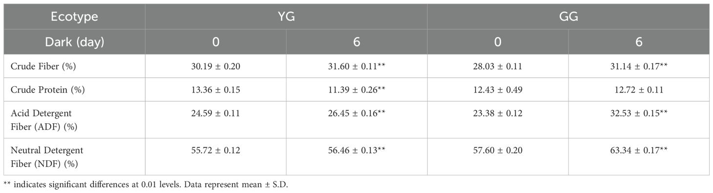 In addition to the direct analysis of proteins through gel electrophoresis, crude protein is another common parameter that is used to describe the nutritional value of forage. Similar to the results obtained from the gel analysis, compared with the control leaves, the dark-treated YG leaves presented a significant reduction in crude protein levels. However, darkness did not induce a loss of crude protein in the GG samples (Table 1). In addition to proteins, crude fiber (CF), acid detergent fiber (ADF), and neutral detergent fiber (NDF) are typically used to assess the nutritional quality of grass. The three parameters increased following a period of darkness for both types of sheep grasses (Table 1).
