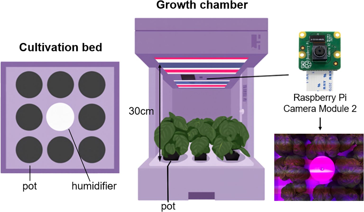 As shown in Figure 1, a total of nine growth chambers were used in this study, and the distance between the bed and the camera of each cultivator was fixed at 30 cm. A single humidifier was placed at the center of each cultivation bed, and eight pots were arranged around it. Cultivation was conducted under different light conditions depending on the growth stage, and each chamber was set with varying combinations of wavelength. The images captured under these conditions reflect diverse growth environments.