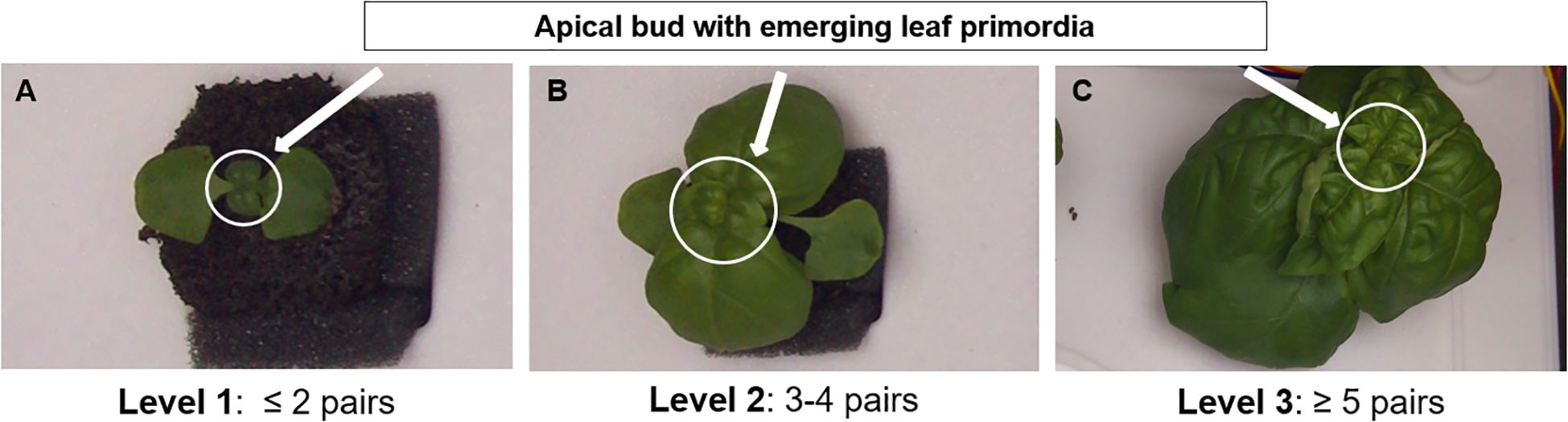 Figure 2. Representative examples of basil (Ocimum basilicum L.) growth stages based on the number of visible leaf pairs from top-view images: (A) Level 1 (≤ 2 pairs), (B) Level 2 (3–4 pairs), and (C) Level 3 (≥ 5 pairs). Arrows indicate the apical bud with emerging leaf primordia used as reference points for stage classification.