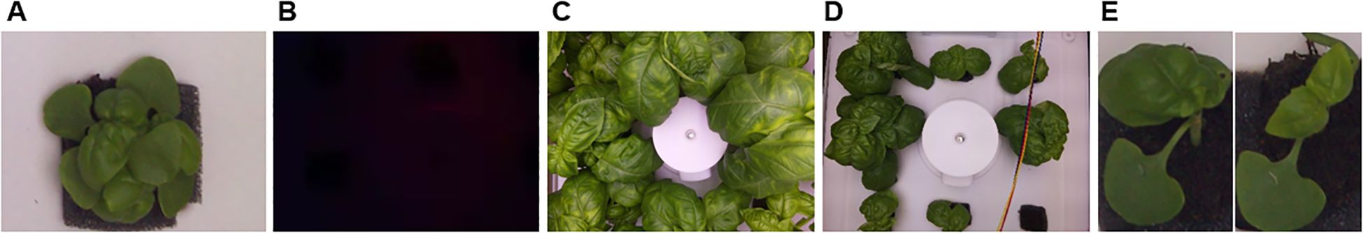 Figure 3. Examples of excluded images during preprocessing. (A) Multiple plants within a single pot; (B) Images captured during the dark period; (C) Plants more than half out of frame; (D) Non-germinated pots; (E) Plants with leaf removal history.